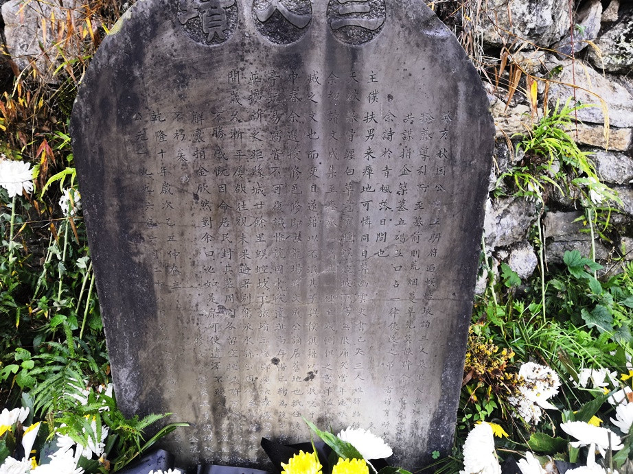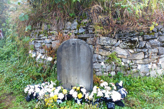 三人坟为块石合砌的墓冢,墓前摆放了不少祭拜的鲜花,看来到此祭拜的人不少。