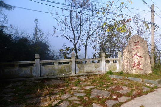 三人坟位于修文县谷堡乡哨上村的蜈蚣坡山腰,距阳明洞约12km,是一个无人管理的景点。一路的公路上有明显的路线指引牌,手机导航也很靠谱。三人坟在公路边的小道旁,公路边立有一块刻着“三人坟”三个大字的石碑,石碑对面的画壁上画着王阳明遥看天生桥的图像,画壁旁边石碑刻着王阳明撰写的《瘗旅文》。“瘗”字读音yi,四声,意思是掩埋、埋葬。