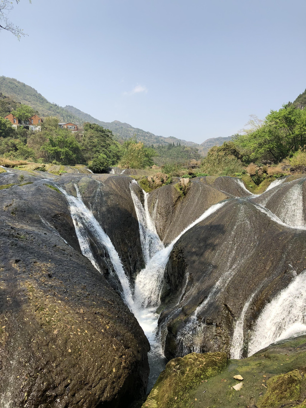 从古桥继续向前徒步是拉雅瀑布、68级跌水瀑布、响水瀑布和龟背山原始森林。