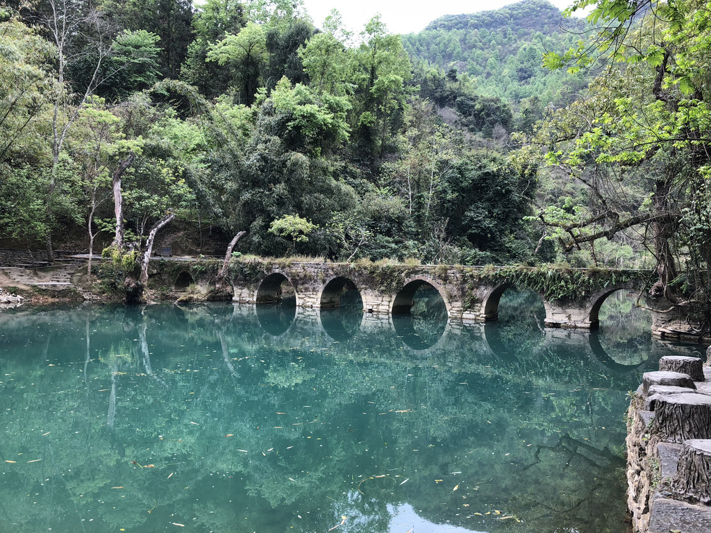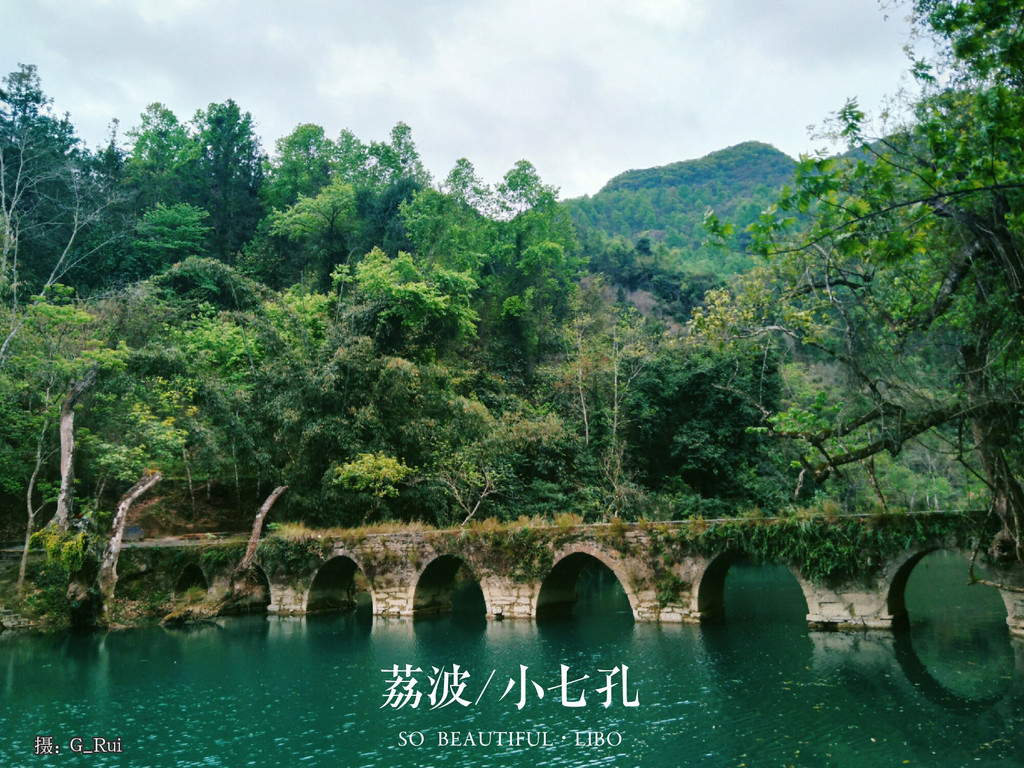 我们坐到荔波县城汽车站,买荔波到小七孔的中巴车票(10元/人),大约20分钟发一辆车,车程约半个小时到四十分钟左右能到达景区,中巴车到的是景区东大门,我们把行李寄存在东大门服务中心啦,然后就买票去浪了,嘿嘿!小七孔门票是130一个人,景区内观光游览车票是40元一个人(时间充足的情况下可以不购买车票,但是景区内各个点之间还是有一定距离的,全靠徒步会比较累)。东门进去第一个点是小七孔古桥。著名的景点,人是真心多,等了半个多小时才耗走了一大批旅行团,拍到了一张没有人安安静静的古桥。