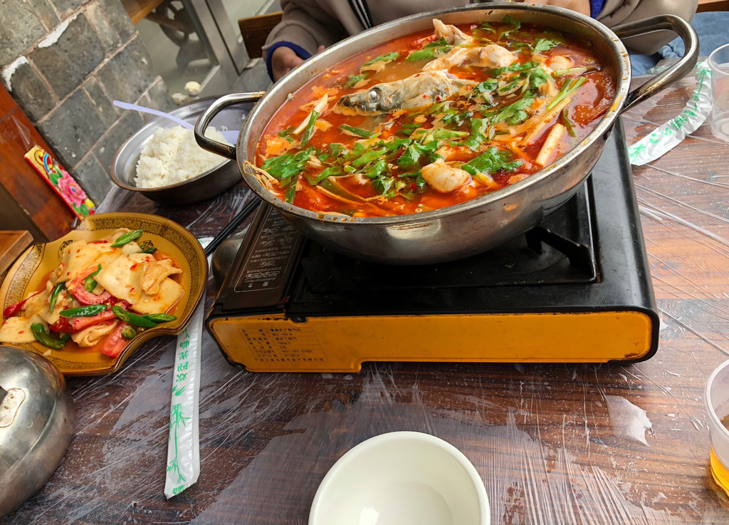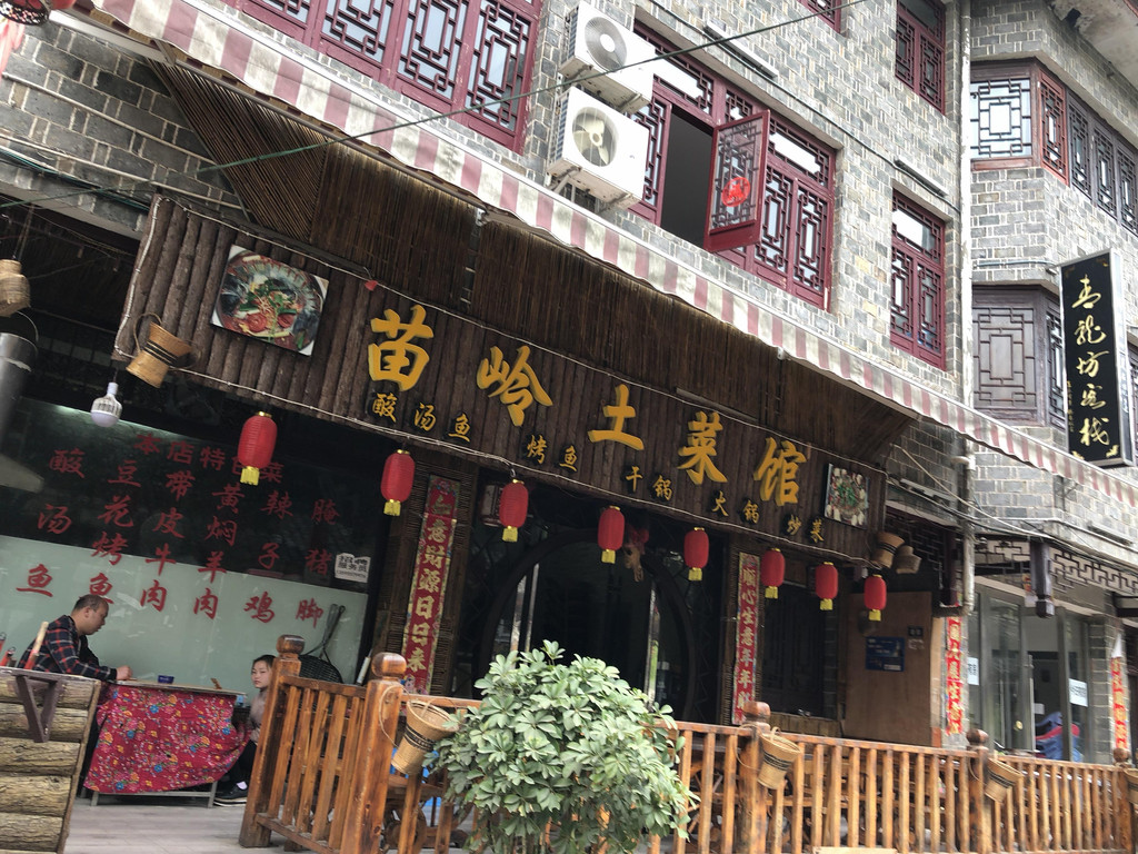 回到客栈附近舞阳河边选了一家苗岭土菜馆,团购了一个88元的套餐,里面包括酸汤鱼,一份苗王豆腐还有涮菜。