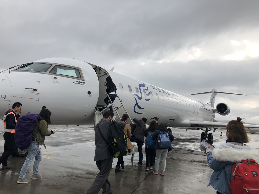 由于提前在网上订好了九点二十贵阳直飞荔波的机票(94元/人),所以今天就早早起床了,七点左右打车去机场(62元),八点多过完安检,就在登机口等着登机了。这次乘坐的是华夏航空的庞巴迪机型,第一次坐小型客机,想想还是有些激动呢,嘻嘻!