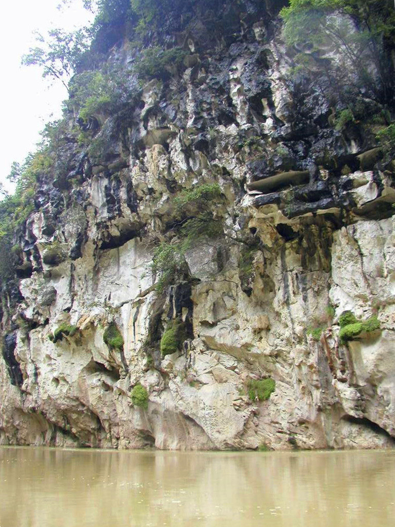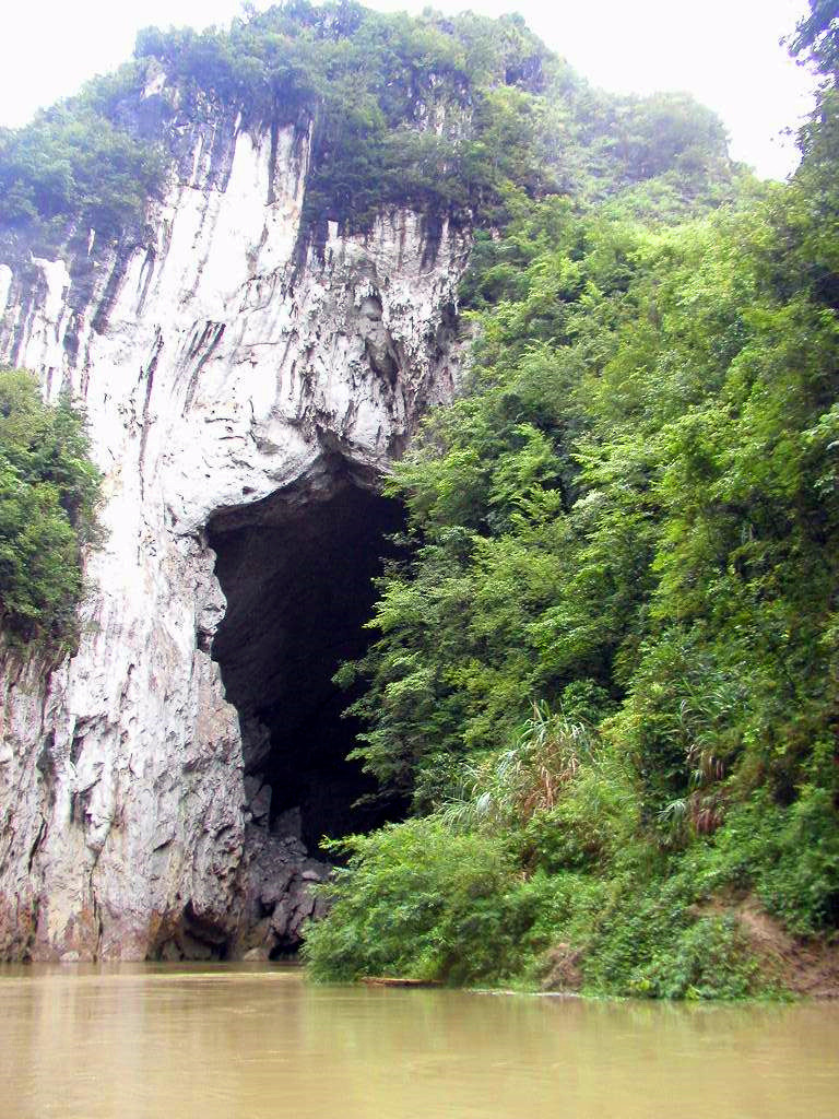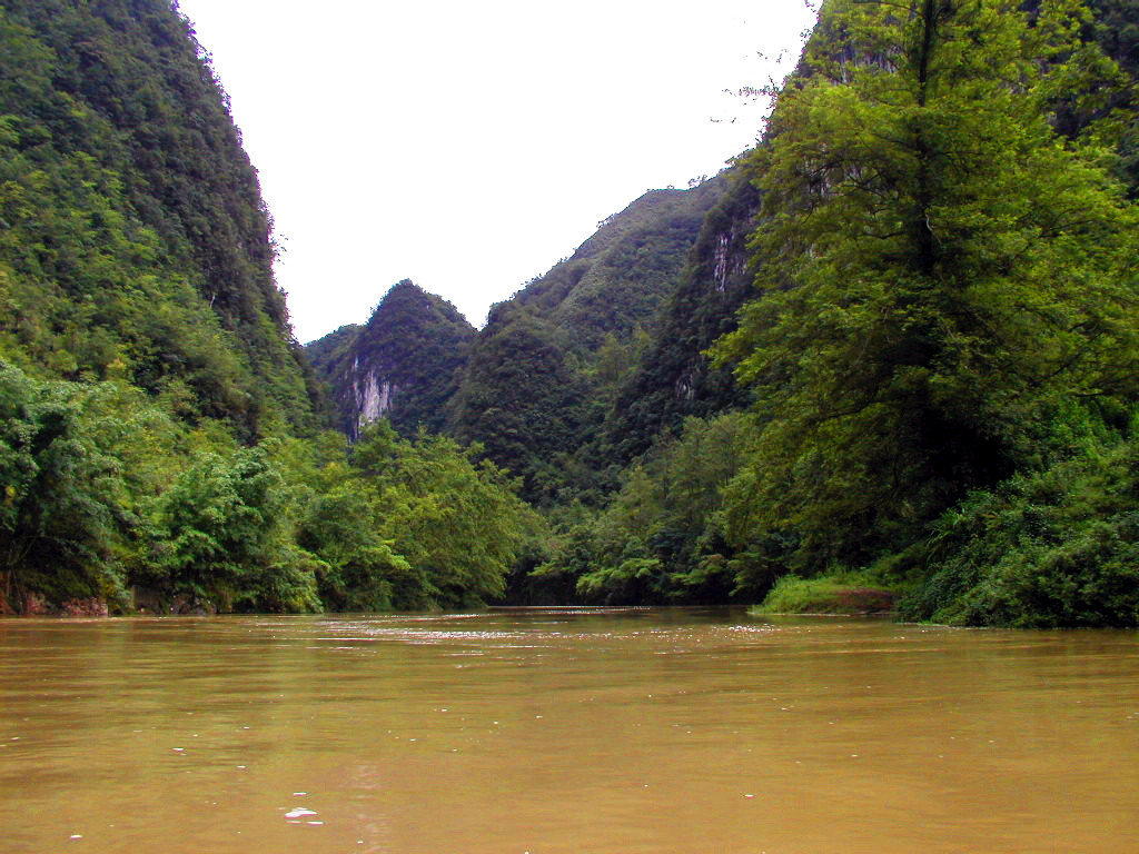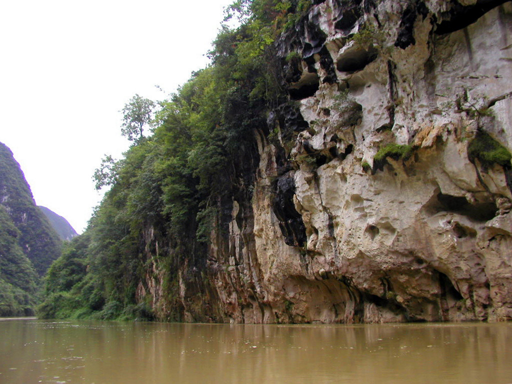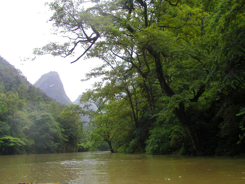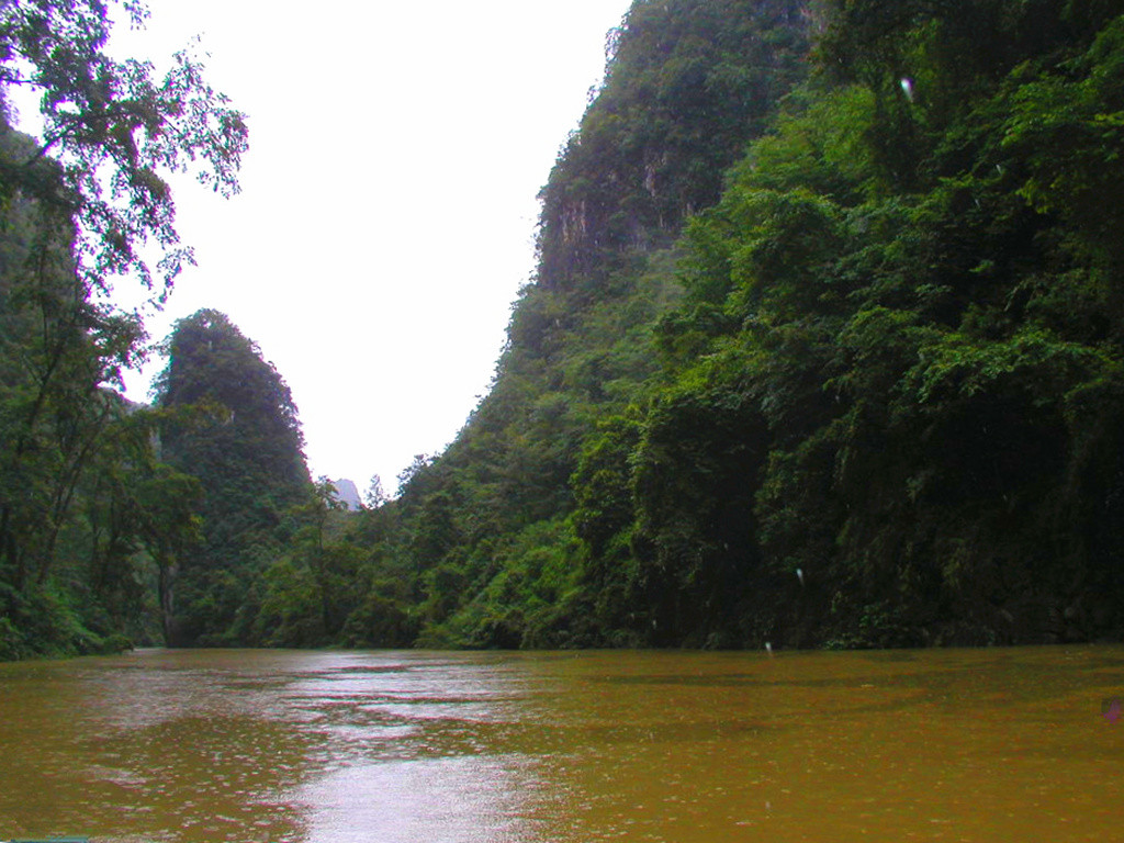 小船沿峡谷中的大河逆流而上,水绕山行,小船就行驶在连绵的峰林中。只见奇峰林立,陡岩飞 瀑,翠竹掩舍,碧水中流,轻舟渔歌,有着世外桃源般的美景。小雨细细沥沥的在滚滚的大河上溅起朵朵水花。据导游介绍,因为连日大雨,大河涨水,使得水如黄河般浑黄。难怪我们一路走来,看到许多大树都浸泡在水中呢。据说雨季一过,水会碧绿清澈的。不过导游也说,正是因为涨水,我们的船才能进入天星洞,去探索悬棺之谜。这里称大河其实河并不大,也不长,因这里有个大河苗寨而得名。现在人们叫它格凸河了。