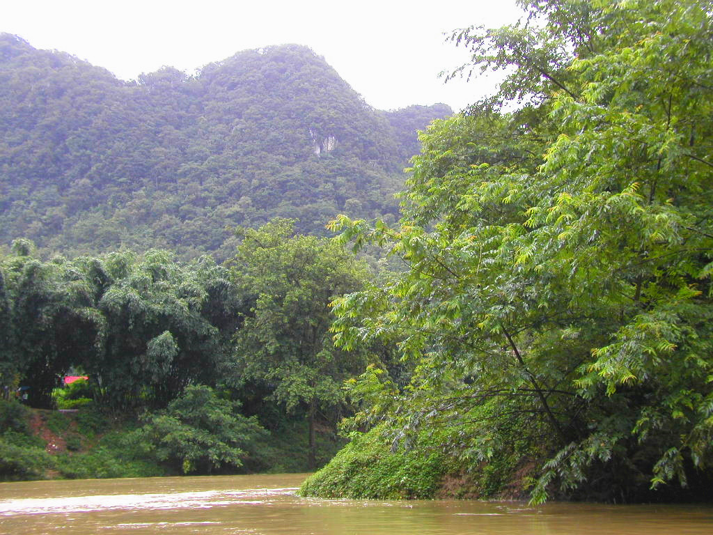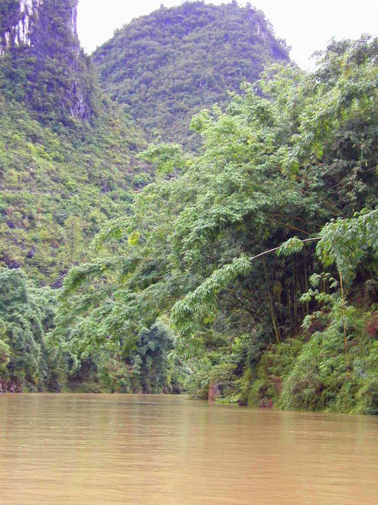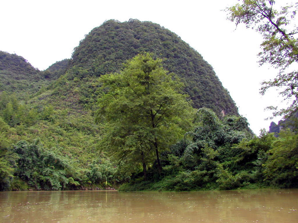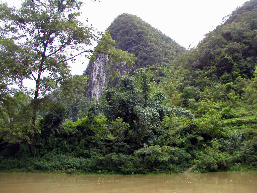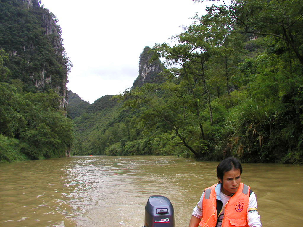 小船沿峡谷中的大河逆流而上,水绕山行,小船就行驶在连绵的峰林中。只见奇峰林立,陡岩飞 瀑,翠竹掩舍,碧水中流,轻舟渔歌,有着世外桃源般的美景。小雨细细沥沥的在滚滚的大河上溅起朵朵水花。据导游介绍,因为连日大雨,大河涨水,使得水如黄河般浑黄。难怪我们一路走来,看到许多大树都浸泡在水中呢。据说雨季一过,水会碧绿清澈的。不过导游也说,正是因为涨水,我们的船才能进入天星洞,去探索悬棺之谜。这里称大河其实河并不大,也不长,因这里有个大河苗寨而得名。现在人们叫它格凸河了。