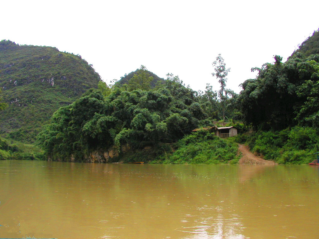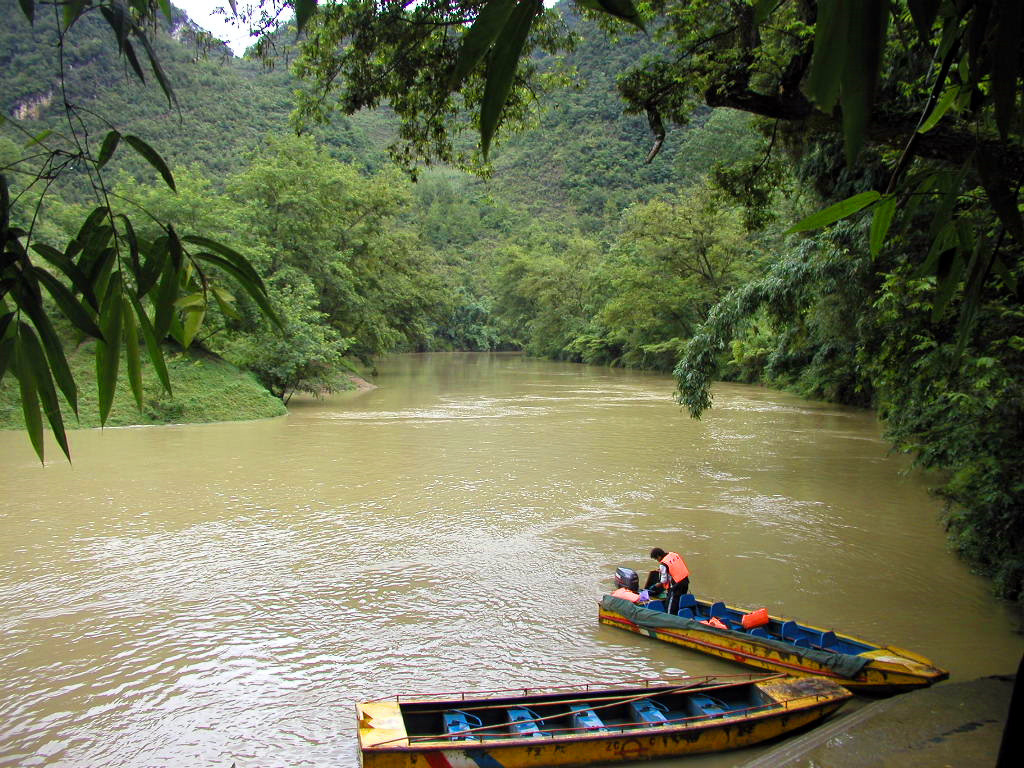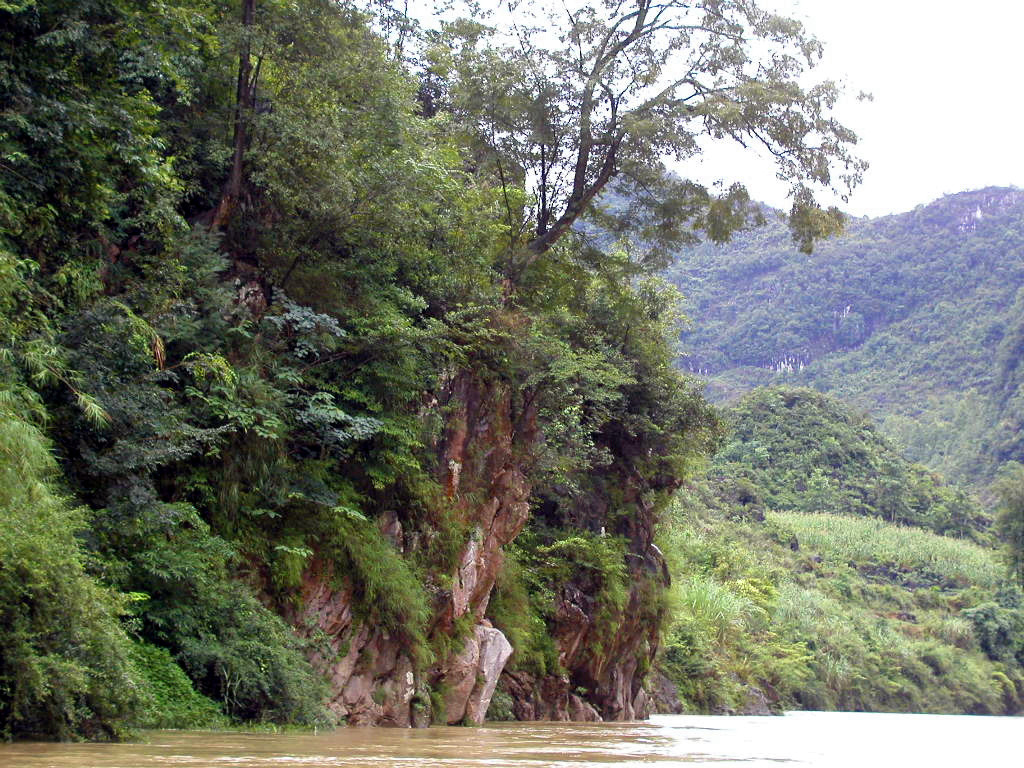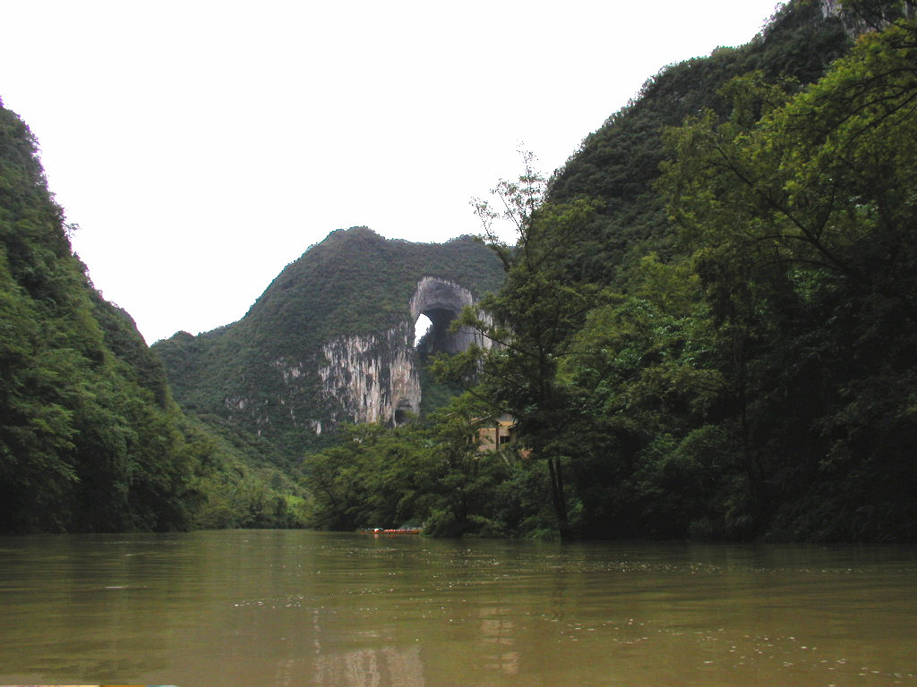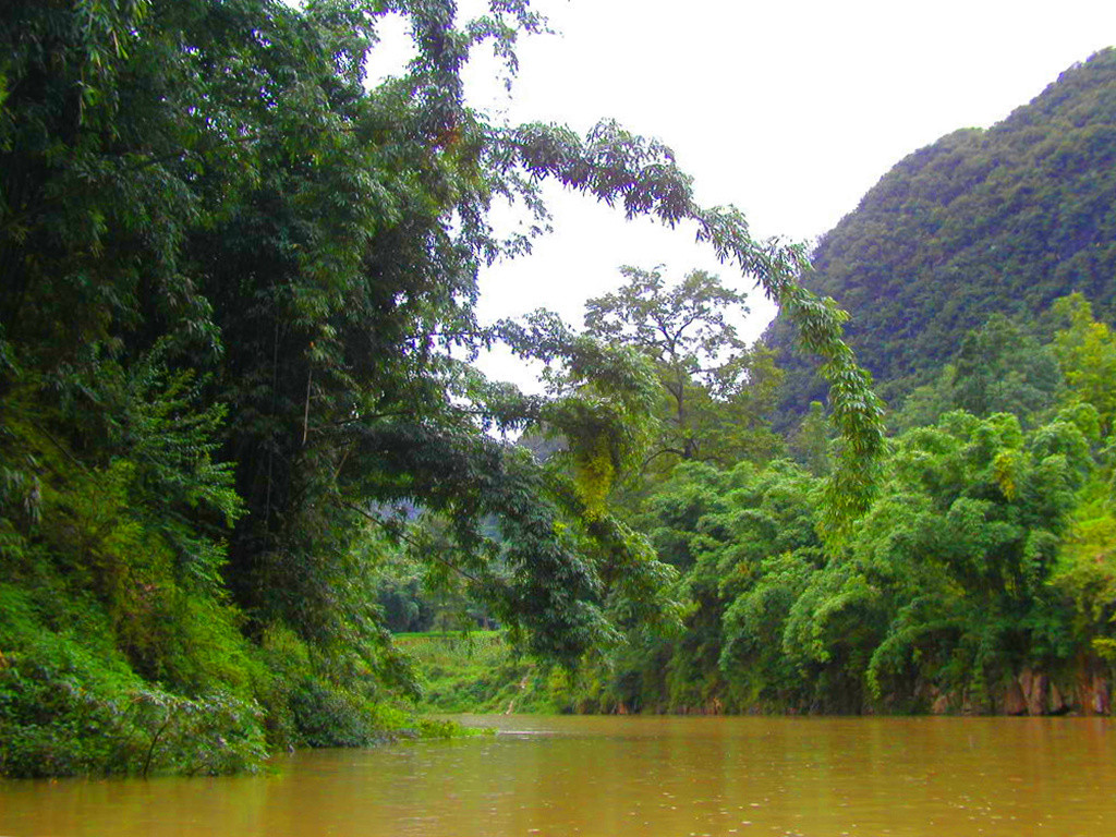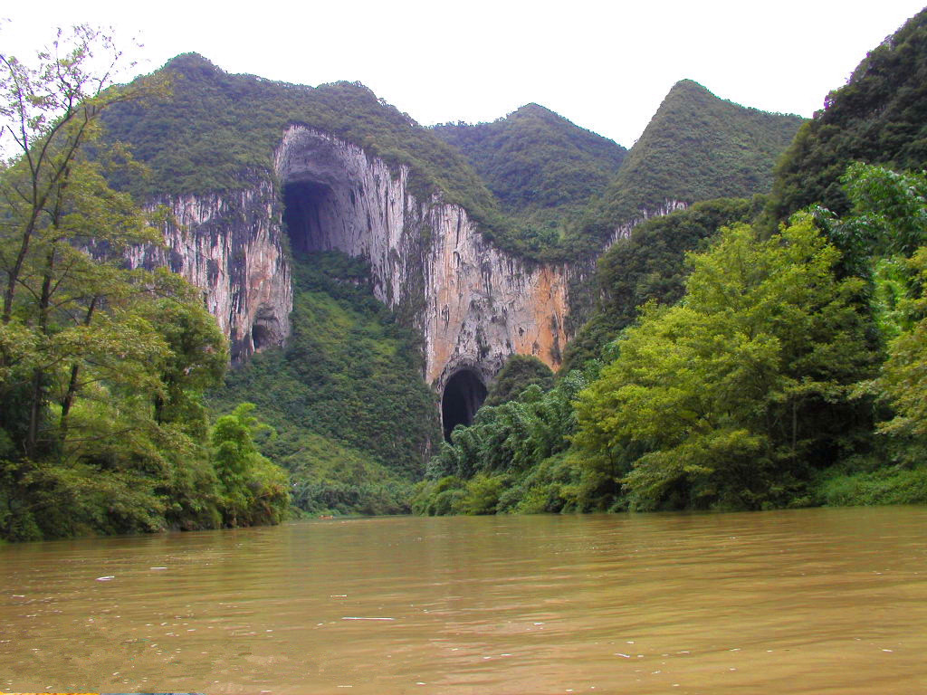 小船沿峡谷中的大河逆流而上,水绕山行,小船就行驶在连绵的峰林中。只见奇峰林立,陡岩飞 瀑,翠竹掩舍,碧水中流,轻舟渔歌,有着世外桃源般的美景。小雨细细沥沥的在滚滚的大河上溅起朵朵水花。据导游介绍,因为连日大雨,大河涨水,使得水如黄河般浑黄。难怪我们一路走来,看到许多大树都浸泡在水中呢。据说雨季一过,水会碧绿清澈的。不过导游也说,正是因为涨水,我们的船才能进入天星洞,去探索悬棺之谜。这里称大河其实河并不大,也不长,因这里有个大河苗寨而得名。现在人们叫它格凸河了。