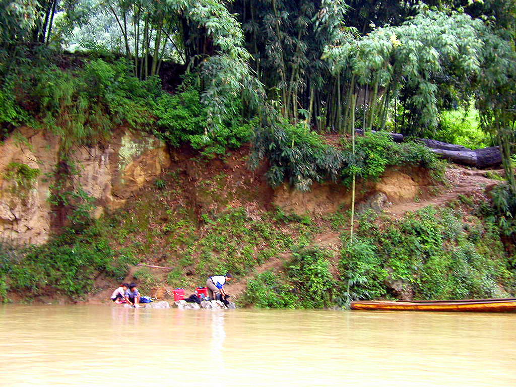 舟行时,忽见前方一边孤峰倾斜,一侧火烧赤壁,大河被两峰夹峙,河道一下子收缩了。这就是号称一线天的夹山,也叫情人岩,当然是因为这一个美丽的爱情传说而得名。来到贵州我就发现,虽说贵州地无三尺平,到处是像窝头一样的石头山,可因为这里雨水多,所以这些窝头都是绿色的。上面长满了植被和大树,真是让人欣喜。我们在大河中逆水而上,两岸一片葱绿。最奇特的是那一丛一丛的翠竹,像钓鱼杆一样,稍头垂进水中却不倒。导游告诉我们它的名字叫钓鱼竹。在格凸,竹子是人们赖以生存的植物,当地人“宁可食无肉,不可居无竹”,有人家的地方必有竹子。世界上竹子的种类有32种,格凸就有15种。什么棕竹、香竹、水竹、麻竹、龟背竹,凤尾竹,处处可见。最奇特的是盲谷有一种四方形竹,这是一种看似圆,而摸着方的奇特竹子。对于当地苗族人来说,竹子不止是和他们生活息息相关,而且还是神圣的。如果谁家的孩子或怀孕妇女有了难治愈的毛病,就在房前屋后栽下竹子,大人孩子的病就真的好了。除了竹子,各种植物品种繁多,那些被称为夫妻树、苦命花的植物,哪一种都有一段凄婉动人的故事。那柔枝飘逸的萱草,挂在岩石上金黄色的石斛(当地叫马棒花),还有多姿多态的芙蓉都是珍贵的药材呢。