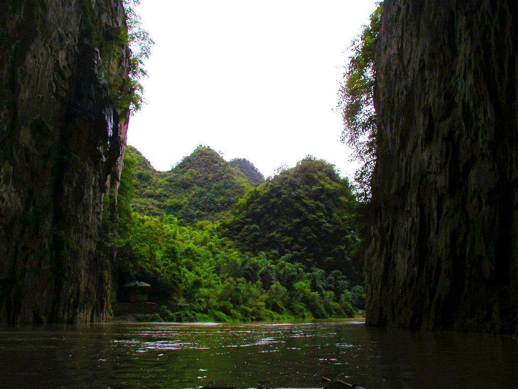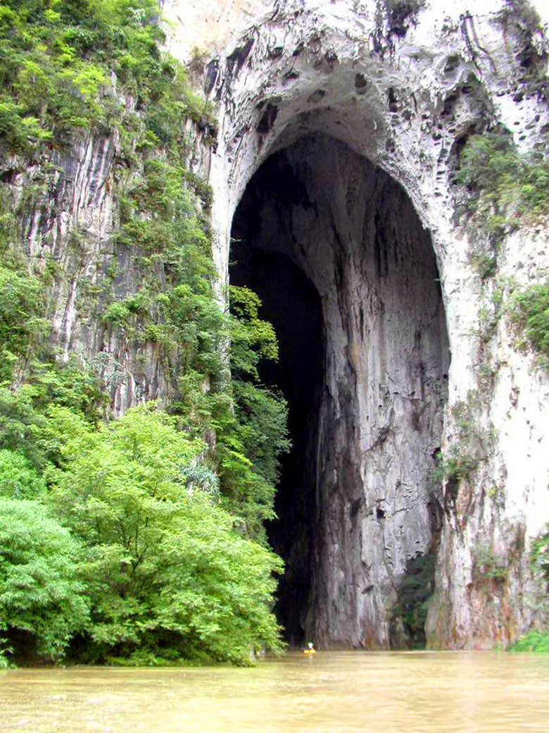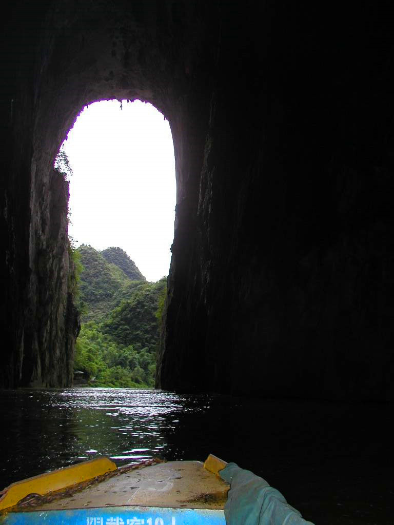 我们的小船轻轻的向燕王宫划进,听导游说,这巨大的穿洞的拱门高116米,宽25米,仰头看时,我们的船真是小的可怜了。进入拱门,就是格凸河伏流入口燕王宫,从在这里,格凸河又潜入了地下,神秘的消失了。每年农历清明到重阳,数十万只燕子栖身洞内。早上天一亮,上万只燕子从洞中飞出,它们穿梭如箭,黑压压的遮天蔽日,甚为壮观。不过要看这一奇观必须在苗寨住一晚,黄昏看燕子归巢,清晨看燕子离巢。我们因不住,自然没有这样的眼福了,但还是看见了不多的几只小燕子在洞外飞舞,远看竟好像小麻雀一般。