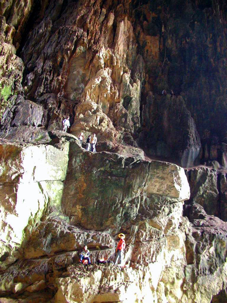 泛舟进宫,是长277米的地下湖,湖的尽头,是面积有11.6万平方米的苗厅。是世界上第二洞厅,在亚洲则是最大的,里边可停上千辆汽车呢。巨大的塌陷的洞顶形成一个直径200米、深370米的巨大通天洞,光线从倾斜的洞口洒下,照见碧绿的格凸河水。当年穷极了的格凸人为了找蝙蝠屎卖钱,发现了这个溶洞,引来了中法洞穴探险队,才最终探明了洞穴的情况,使它揭开了奇妙的面纱,向世人展露它的真实面貌。在燕王宫垂直光溜的百米高的洞壁上,我们看见有两位苗族高手正站在高高的崖壁上,还有几个电视台的人也站在不太高的地方和我们打招呼呢。据说他们正在拍摄当地号称蜘蛛人的攀岩绝技。那么,到底是谁能上绝壁呢?