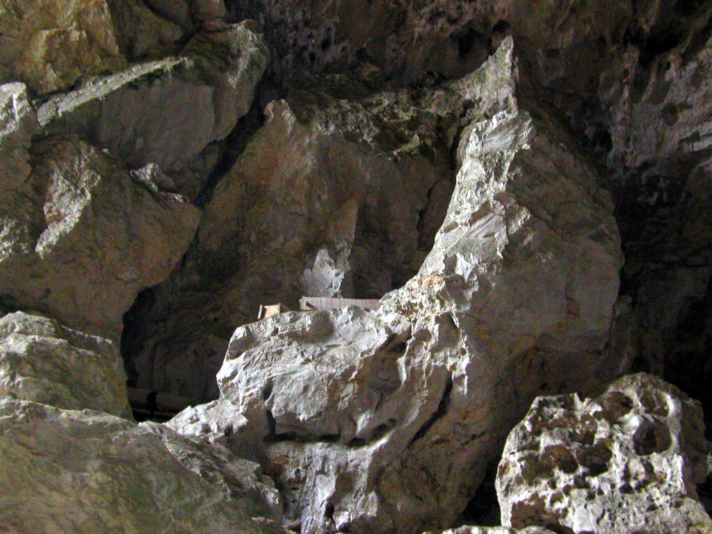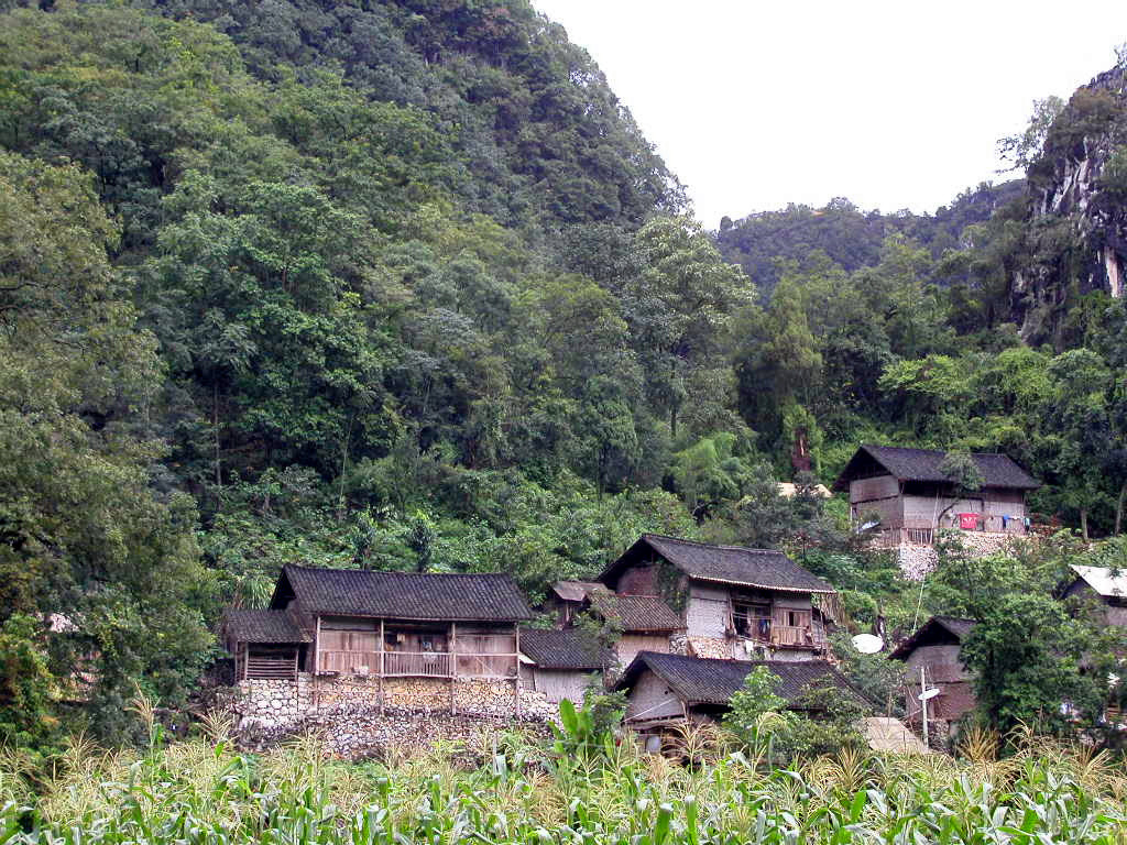 从紫云县城驱车约40公里,沿青山对峙的峡谷逆格凸河而上,就到了伏流出口处的小穿洞,(从大穿洞走,有个岔路)格凸河水又重见天日,流向水电站。在伏流出口上方有上、中、下三个溶洞,洞中苗寨就在高高的中洞。要到达中洞苗寨必须爬山穿过下洞,这是一个布满化石的洞厅,从洞中残遗的地基来看,似曾作过穴居人的村落。沿着因地表塌陷而乱石堆积出的陡坡向上攀登,仿佛置身于人类文明进程的时间隧道。体力好的人大约要走两个多小时,穿过葱郁的竹林,一个高50米、宽115米的巨大洞穹出现在眼前,据说深有215米。在洞口有三间无顶的砖砌房间和一个小操场、篮球架、升起的国旗,那是洞中学校。靠近洞口散布着几十座同样没有屋顶的干栏式木柱竹楼,倒像舞台布景(相片上看,更像手工模型),人们就在这舞台上天天演绎着真实的“山顶洞人”古朴生活。球场边如金蟾的钟乳石承接着洞顶终年不断滴下的甘泉汇成一池,供给着人畜的基本饮水。据介绍,你在洞口外,就能听里面读书、说话、作工、鸡鸣猪叫和锅碗瓢盆发出的回声交响曲,犹如在播放一曲远古的歌谣。一进洞,回声消失,各种声音清晰可辨。据说,这一声学现象与洞顶密布的溶蚀“漩涡”有关。
