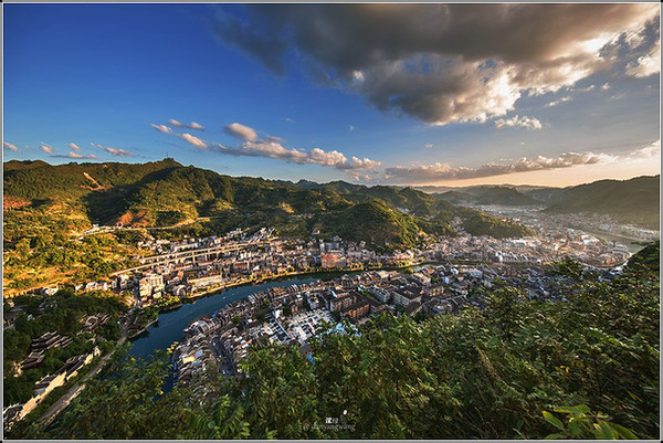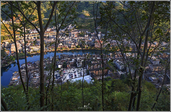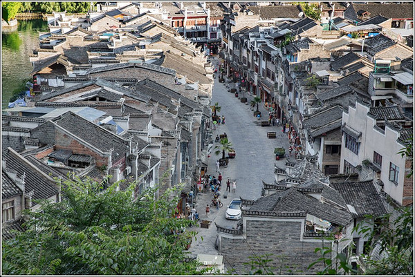 观赏古城全貌,就要登上祝圣桥北面的石屏山。石屏山海拔不高,缓行半小时可到山顶。隆起的山峦把镇远古城包裹在椭圆形的山谷里,宽阔碧蓝的舞阳河呈S形穿城而过,一间间极具特色的民居在河两岸建了起来,山、水、城形成了一个硕大的太极图。