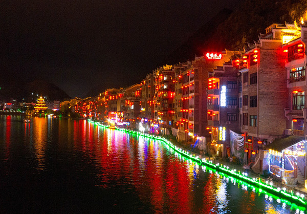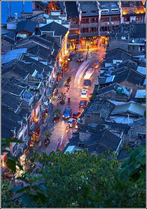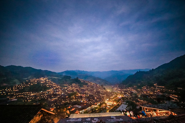 欣赏天下苗寨的千户灯火夜景,一定要最晚7点的时候去占位,一般可以选择观景台或者观景台前面的一排客栈或酒店。基本上七点半前后的十分钟就是最佳拍摄时间,可以看到整个苗寨震撼的动态亮灯过程!