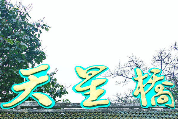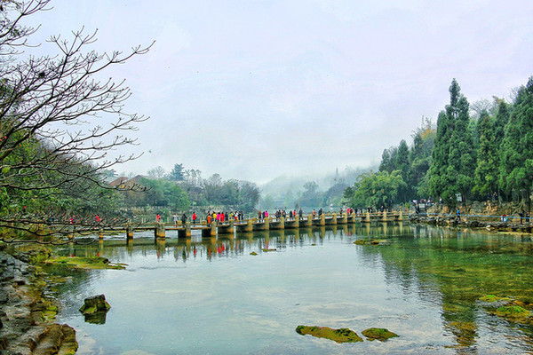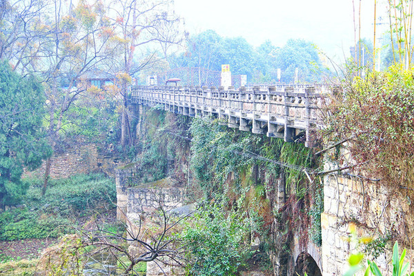 桥下潭水幽兰,两岸古木繁茂,衬托出古桥雅静恬美。
