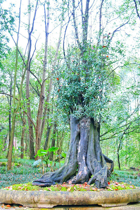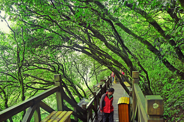 从缆车上站到蘑菇石还有一千四百多台阶栈道。栈道穿过高大遒劲的百年杜鹃林。若是四、五、六月份,便可一簇簇的杜鹃满树绽放。