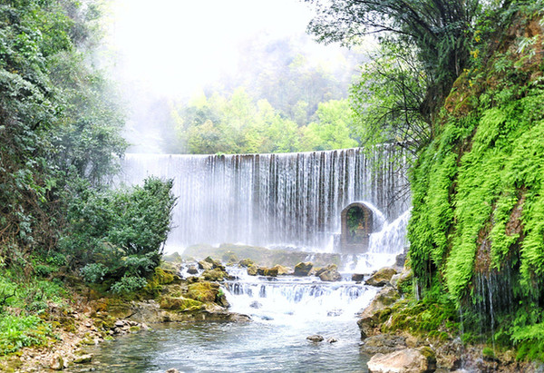 好似玉带于苍翠之间,浪花飞溅,水雾萦绕。
