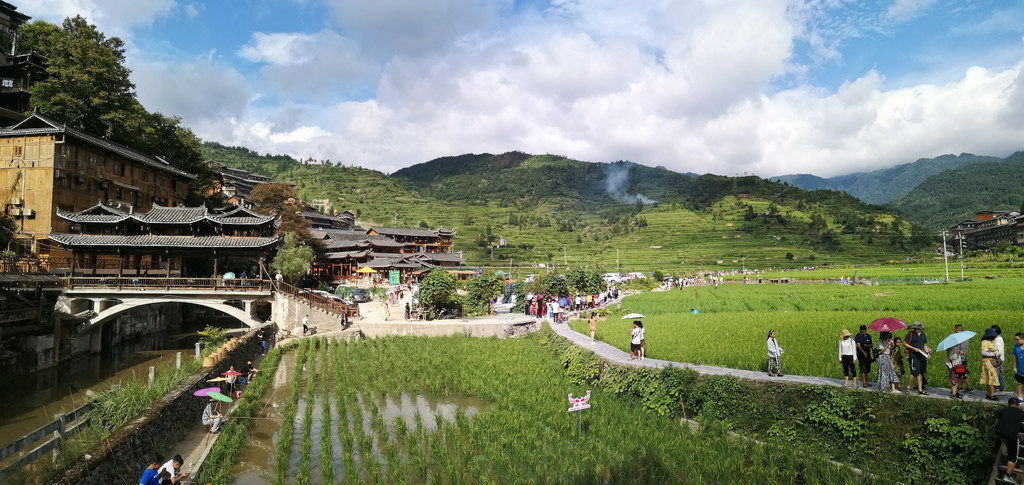 下到古街往东走,出了一号风雨桥,近处翠绿的秧田,远处顺山势而上的青青的梯田,山头漂浮的白云,展开一幅美丽的田园风光,真的很美。
