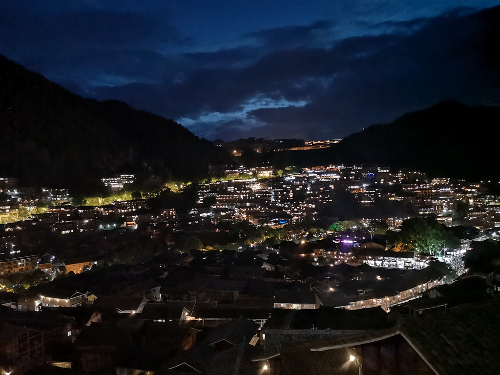 八点钟回到房间,从窗口看出去,千户苗寨的夜景万家灯火,非常美。