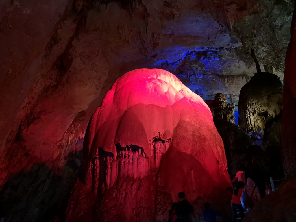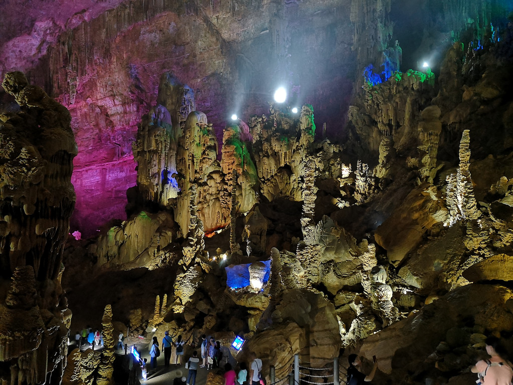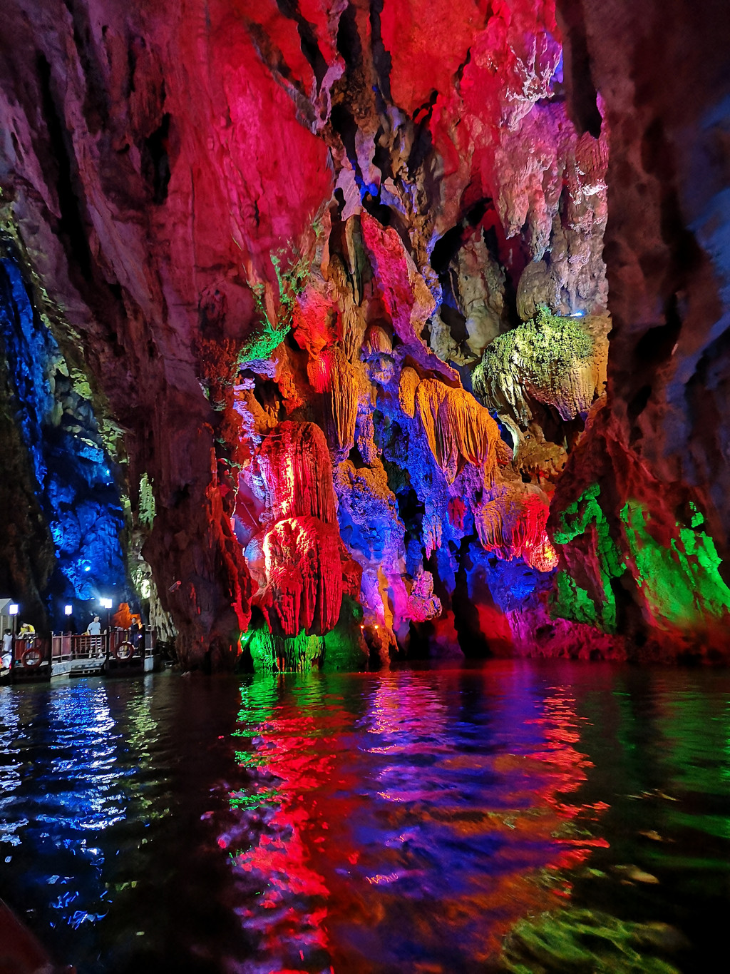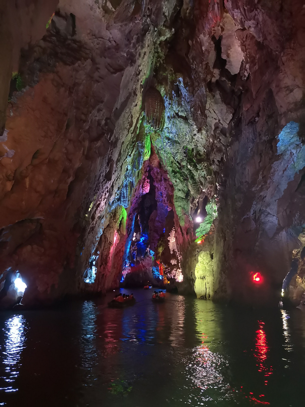 随船进入溶洞,洞内很开阔,洞顶很高,但船行不久,突然进入一条狭窄的河道,只比一条船身略宽,对面的游船过来,只好暂停避让。但穿过这段狭窄的河道,会有柳暗花明的感觉,前方进入了一个更大的洞厅,在彩灯的装饰下,显得绚丽多彩。