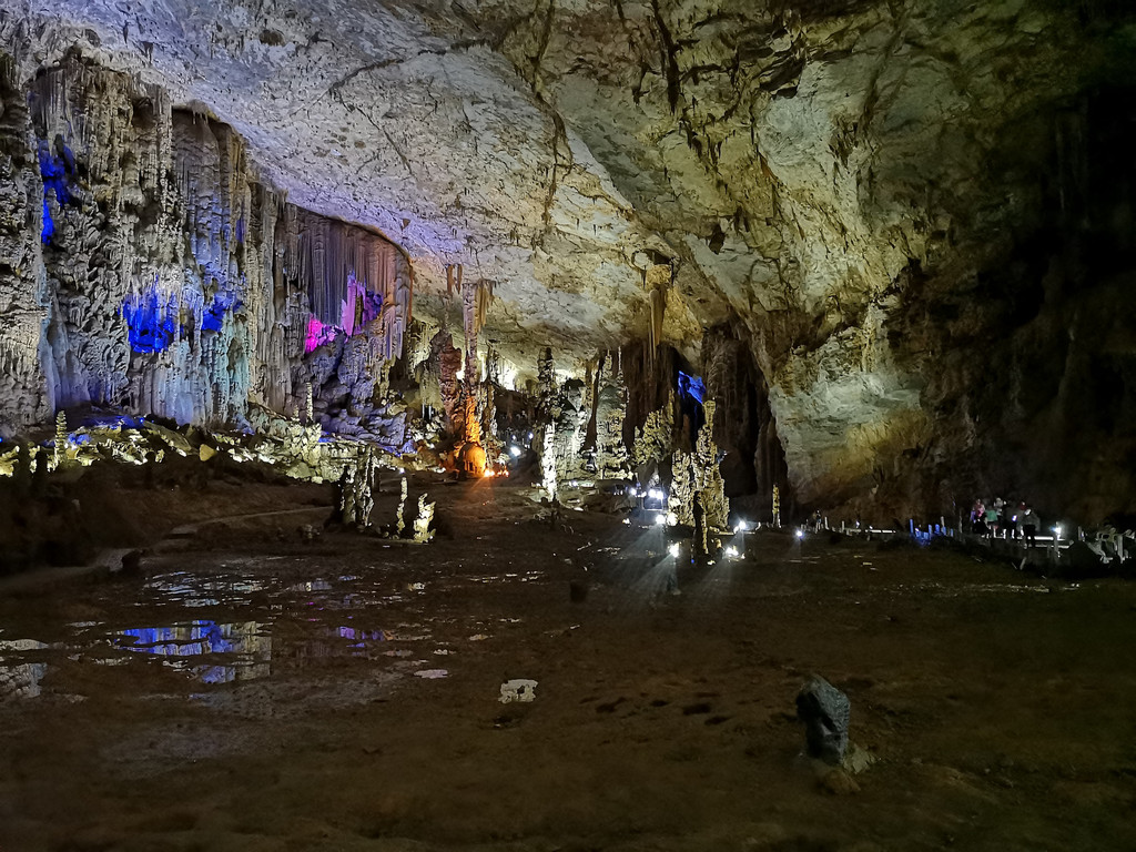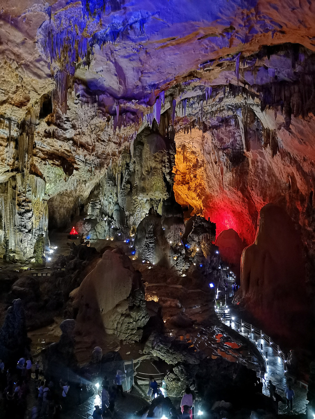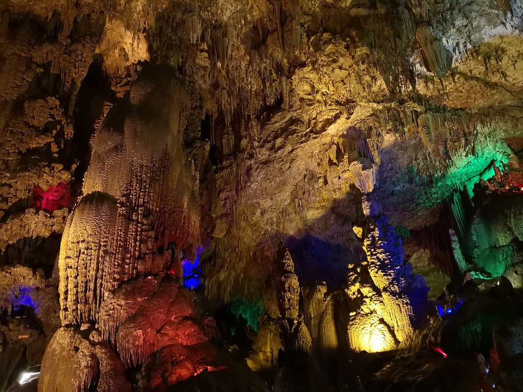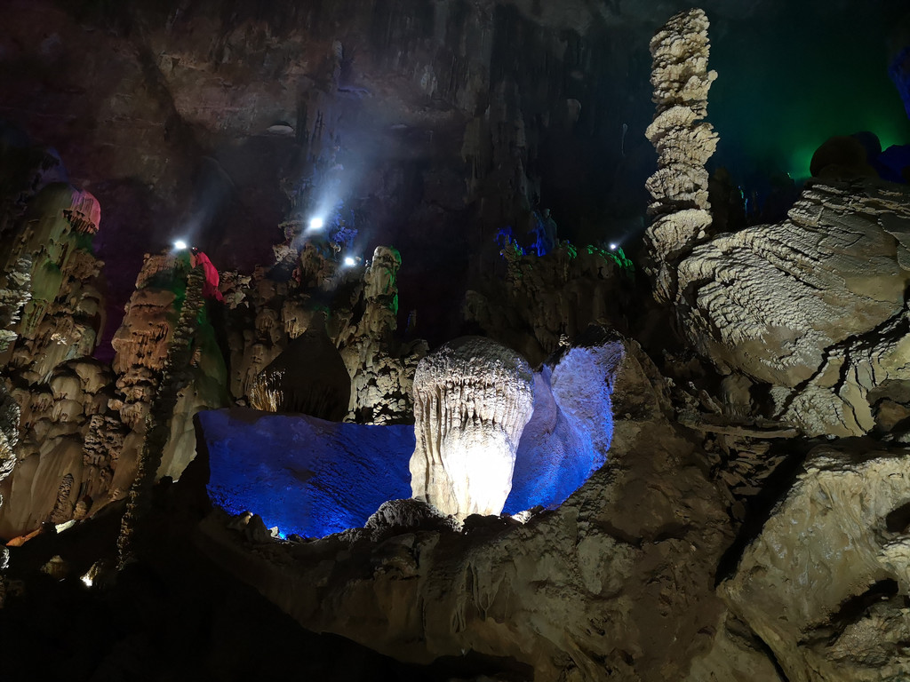 随船进入溶洞,洞内很开阔,洞顶很高,但船行不久,突然进入一条狭窄的河道,只比一条船身略宽,对面的游船过来,只好暂停避让。但穿过这段狭窄的河道,会有柳暗花明的感觉,前方进入了一个更大的洞厅,在彩灯的装饰下,显得绚丽多彩。