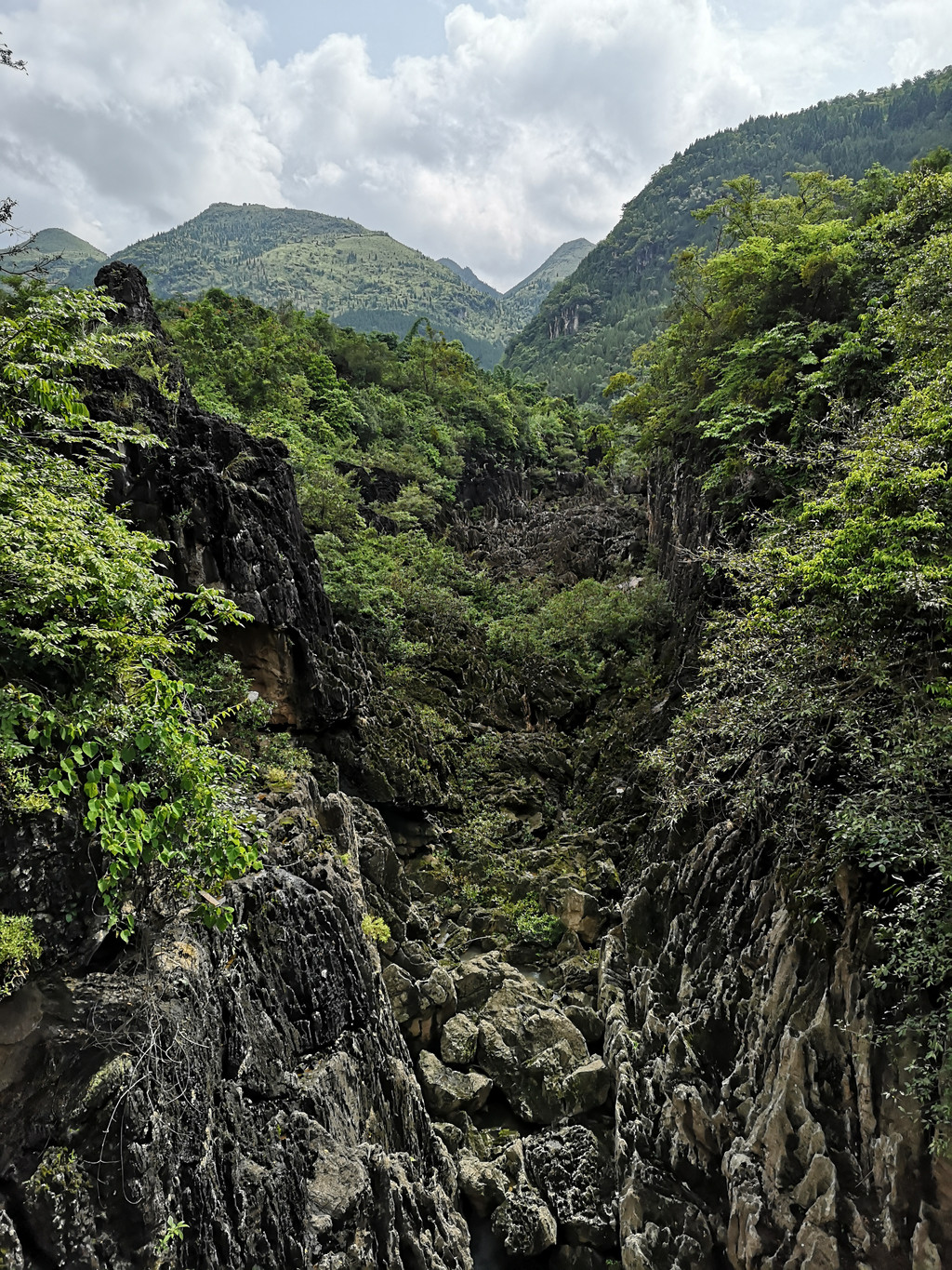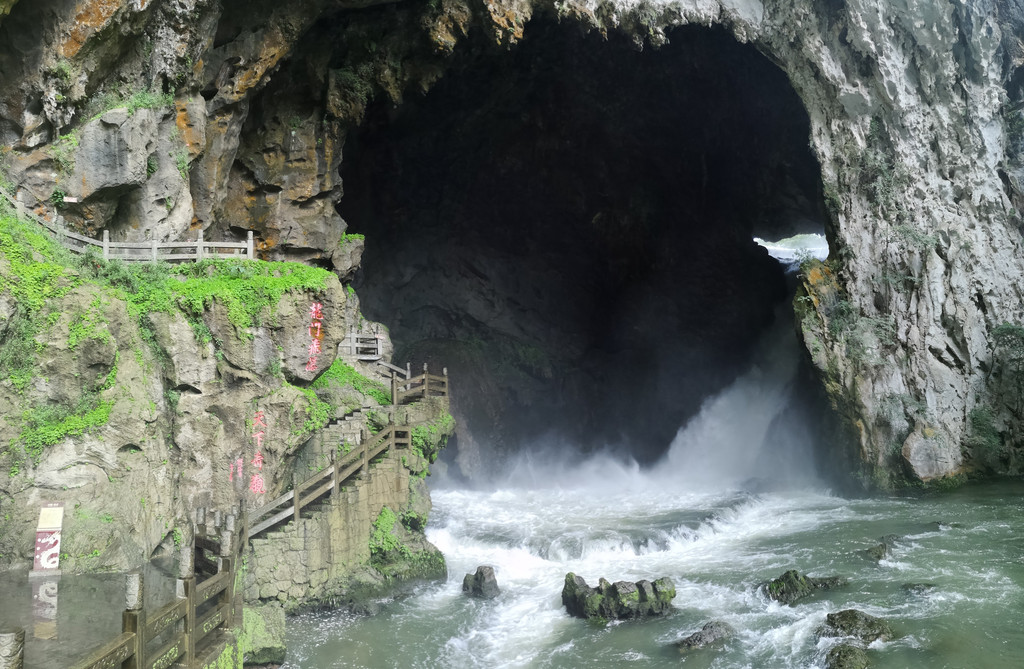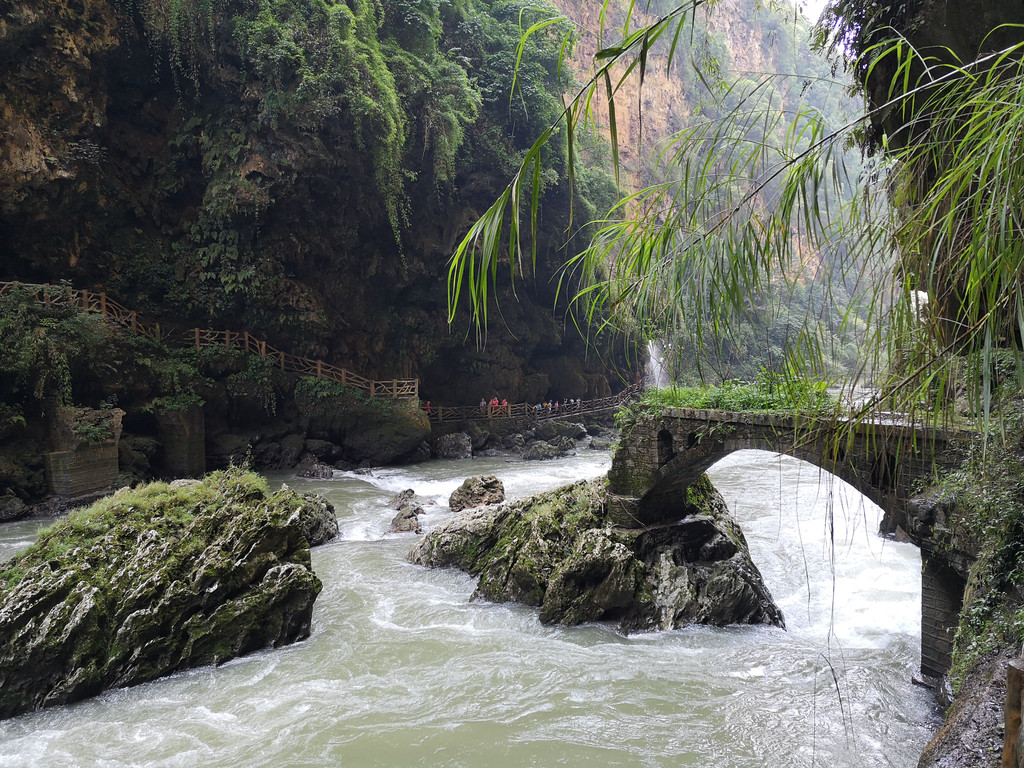 过了桥有两条路前往银链坠潭,一条是沿着峡谷河流走下去,一条穿过天星洞,可能会远一些。我们选择了走天星洞。