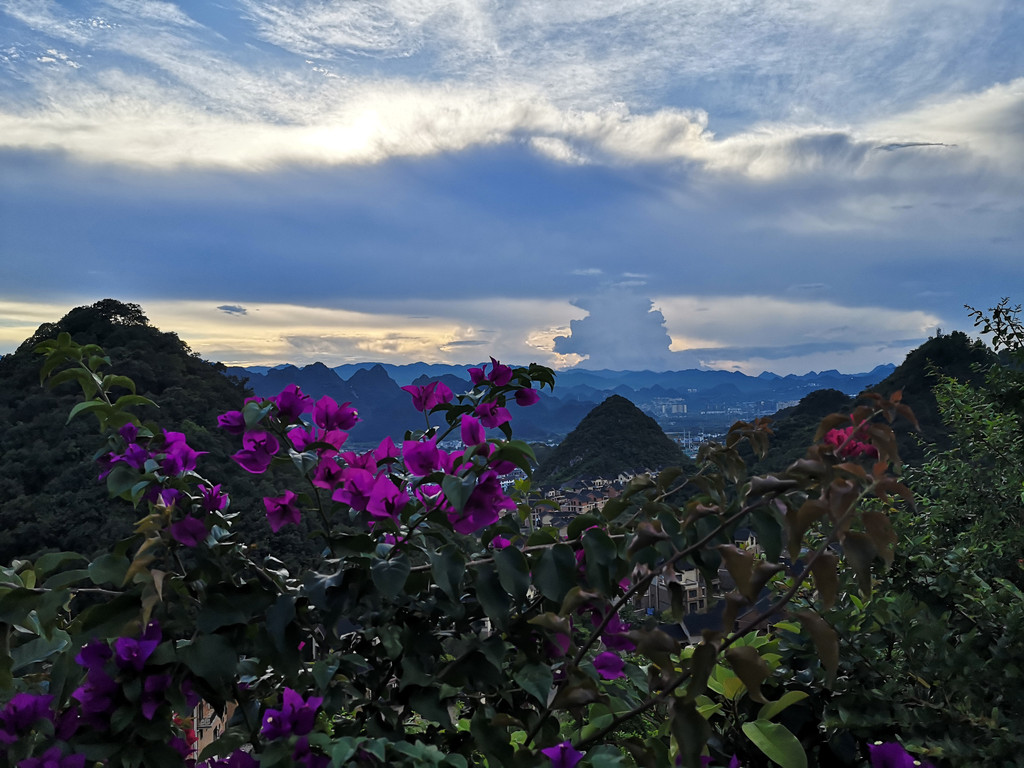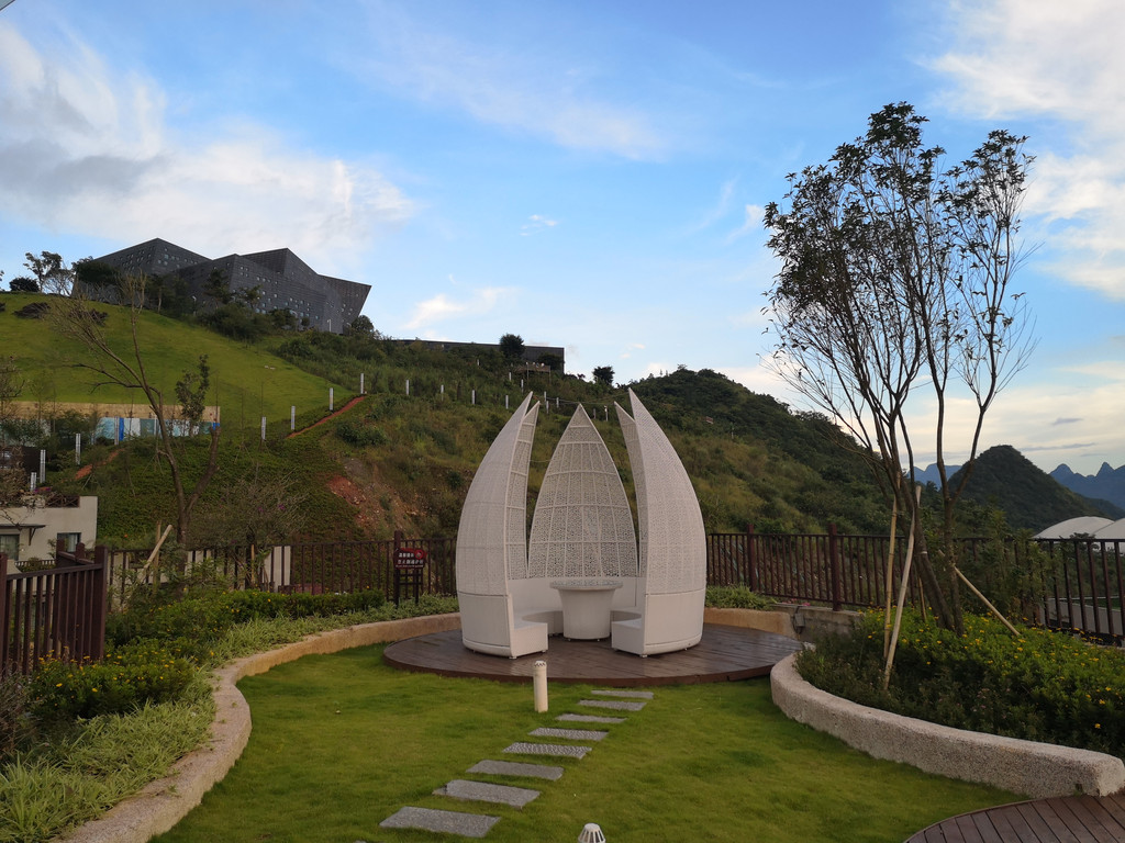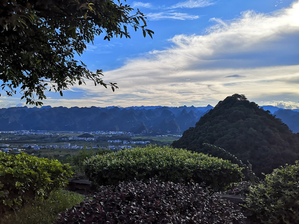 到五点半,开车到酒店后面山顶的国际户外会演中心,其实从酒店可以沿步道上去,但需要爬一段台阶,这个中心和酒店是一家的。从山顶广场可以俯瞰整个万峰林区域。