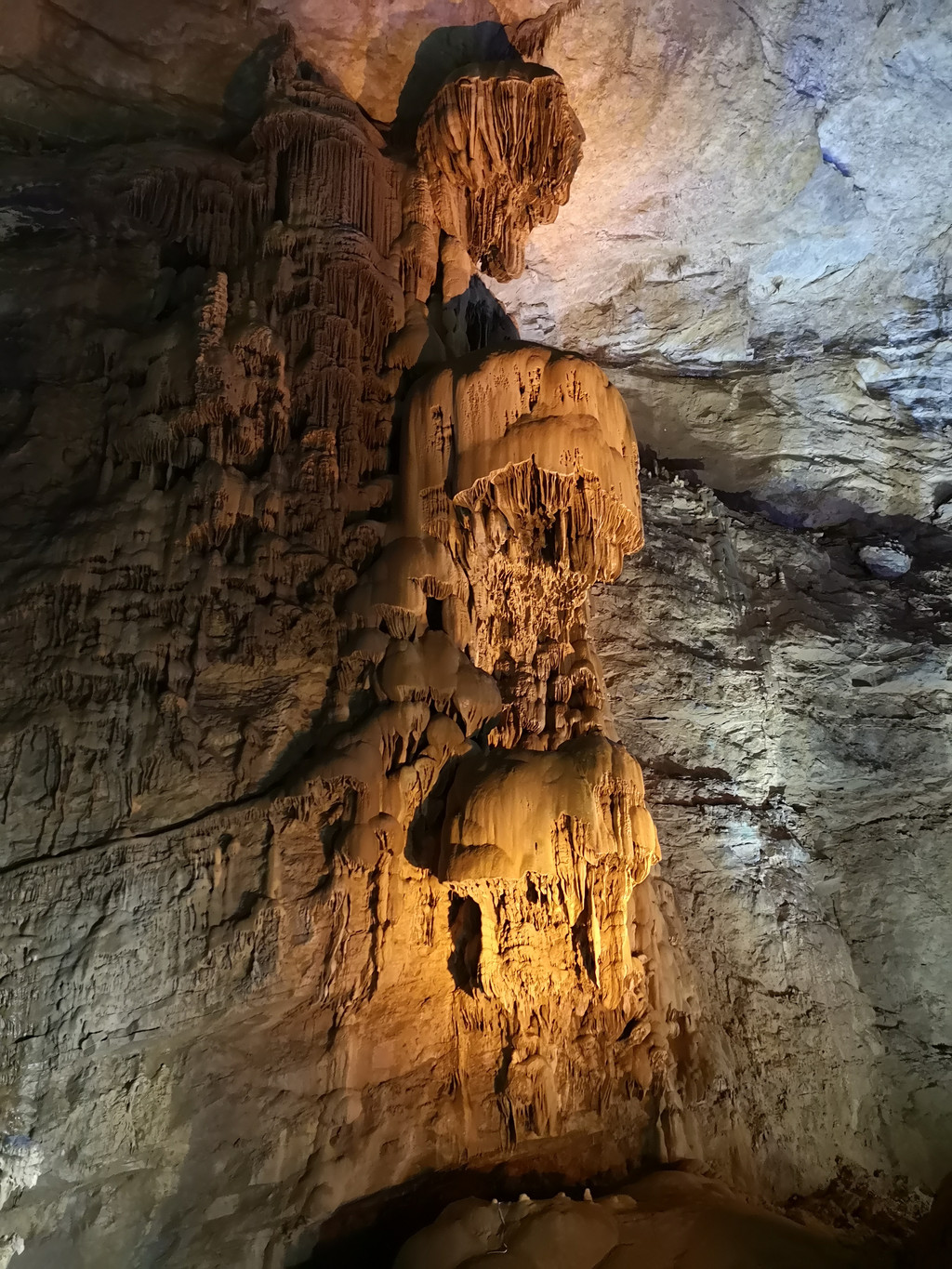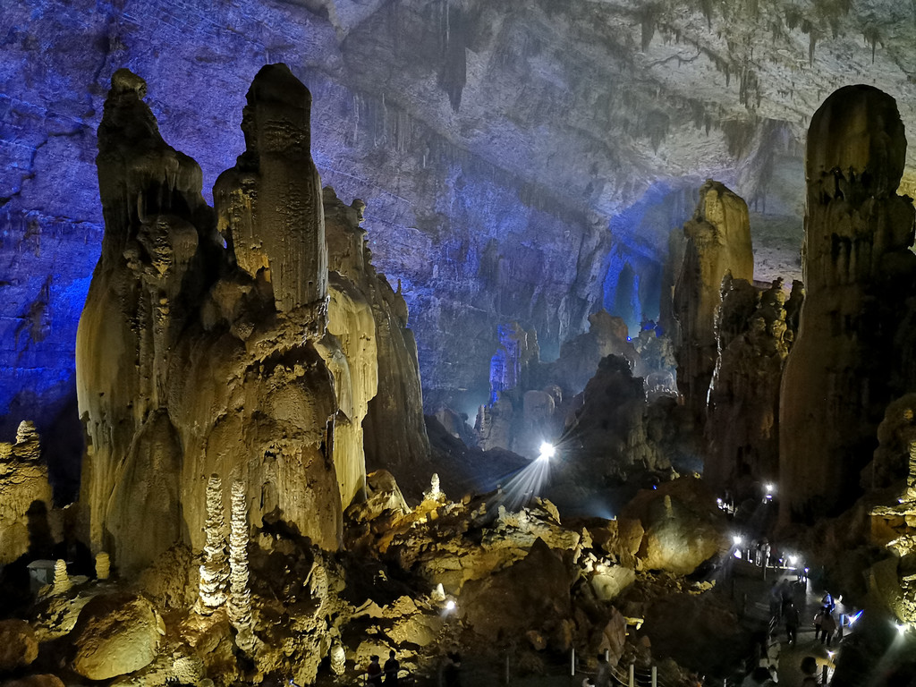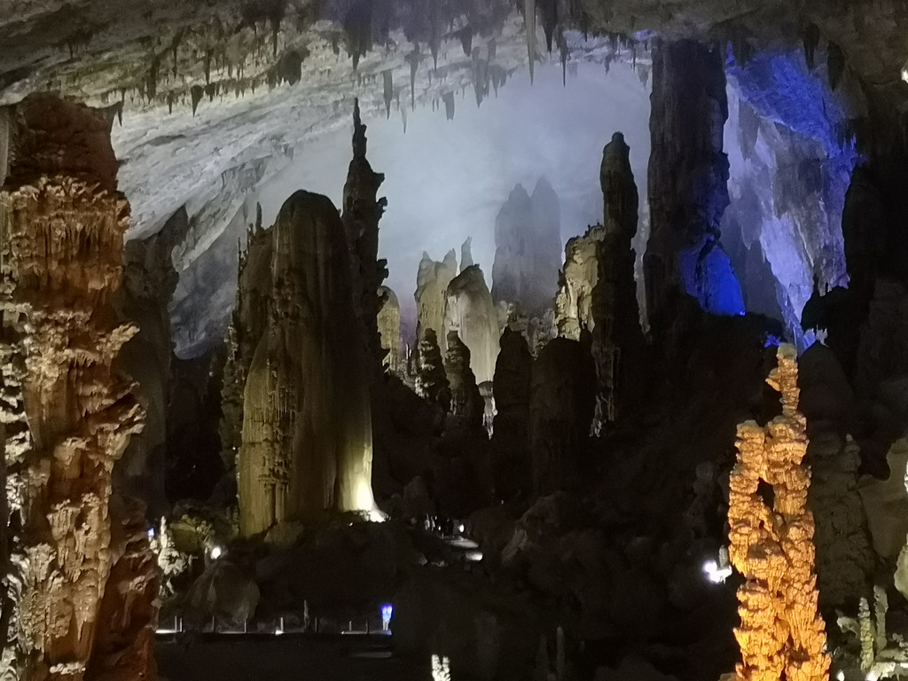 织金洞为世界地质公园,不愧是“中国最美六大旅游洞穴”之首,被称为“中国溶洞之王”,号称“黄山归来不看岳,织金洞外无洞天!”。进入溶洞,果然非常壮观,一个大厅,转个弯,又进入一个更大的厅,迎宾厅、塔林洞、万寿宫、望山湖、凌灵殿、广寒宫、十万大山等。其中在广寒宫洞厅,两山中间的地面相对比较平坦,仰望洞顶,有一种仰望夜幕下苍穹的感觉。而各种形态的石钟乳、石笋、石柱、石幔、石花等等,千奇百怪,令人目不暇接,印象最深刻的有浑圆天成、雪压青松、霸王盔、银雨树、卷曲石、三层华盖、掌上明珠、福禄寿等。