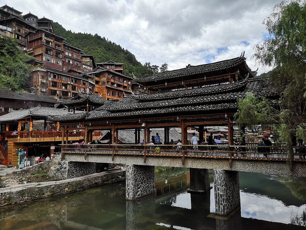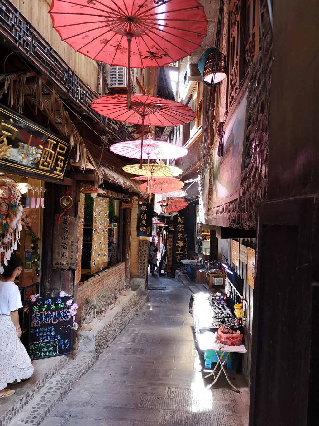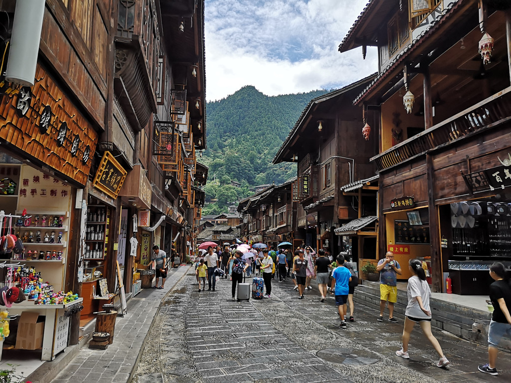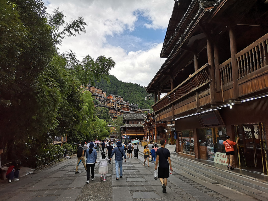 走在青砖铺就的古道上,沿街的木楼都是卖各种食品或民族特色产品的店铺,街的尽头外就是青翠的山岭,街面上摩肩接踵的游客悠闲地踱着步,不时有当地村民从人群中穿行而过,一幅充满了生活气息的苗家古街风光。