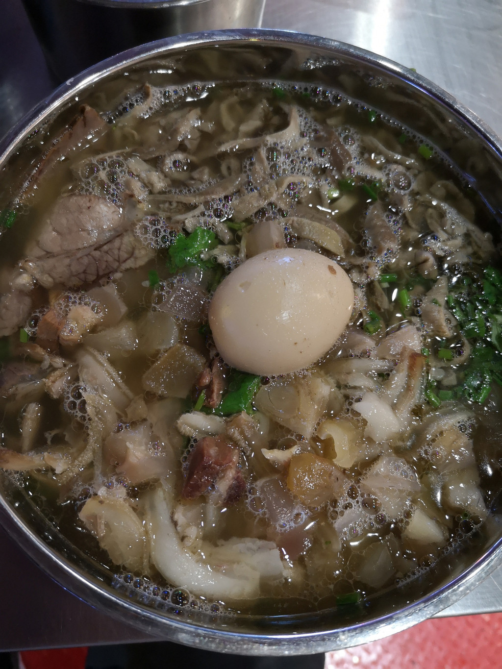 步行十分钟到绿地联盛国际,沿街有很多的小吃店,我们专门坐在露天,每人一碗加牛肉、加牛筋、加牛杂、加牛肚、加鸡蛋的全加牛肉粉,量很足,肉很烂,味道很赞,而价格只要35元/碗。
