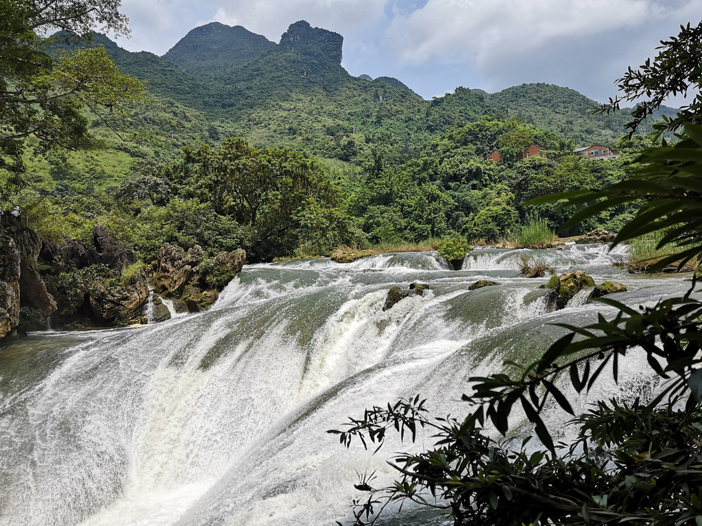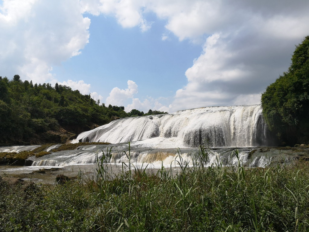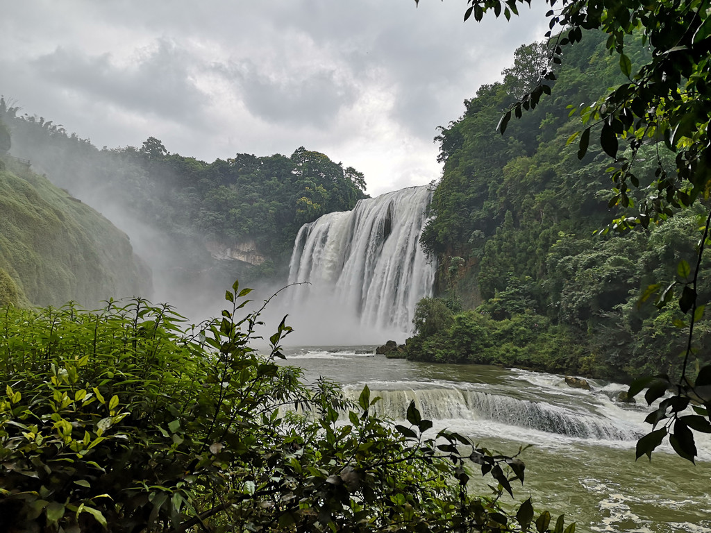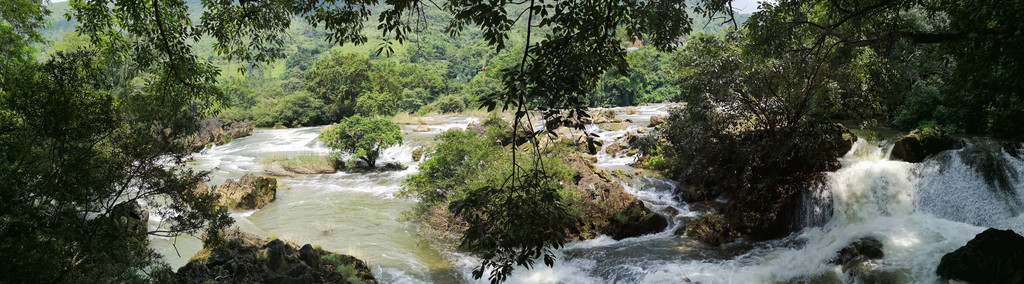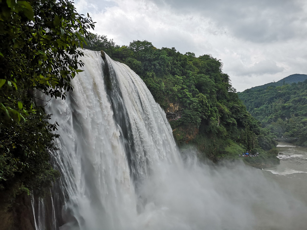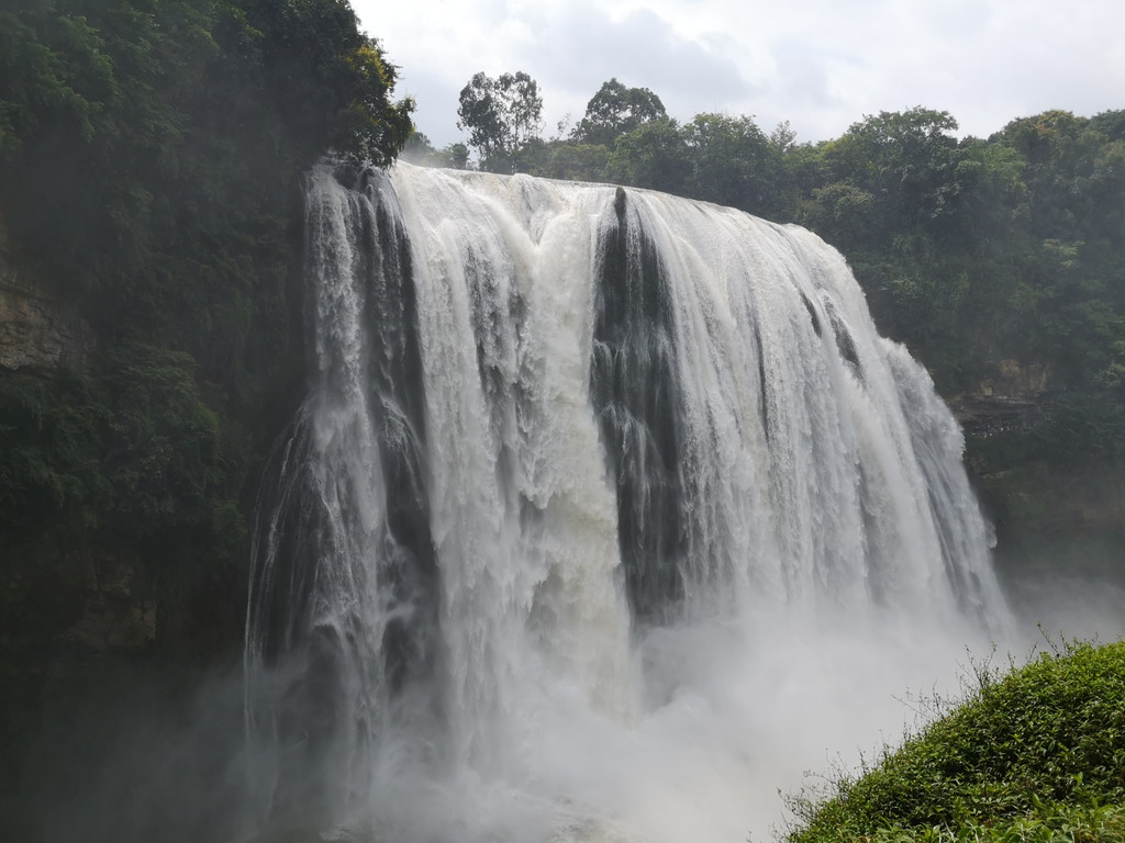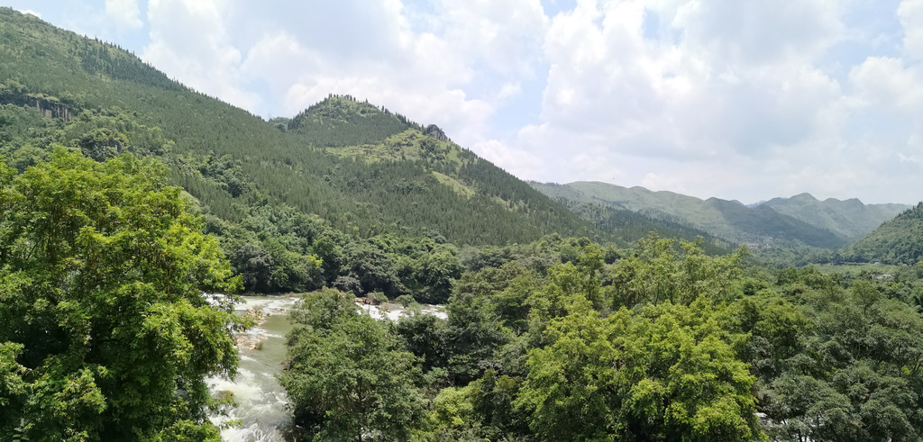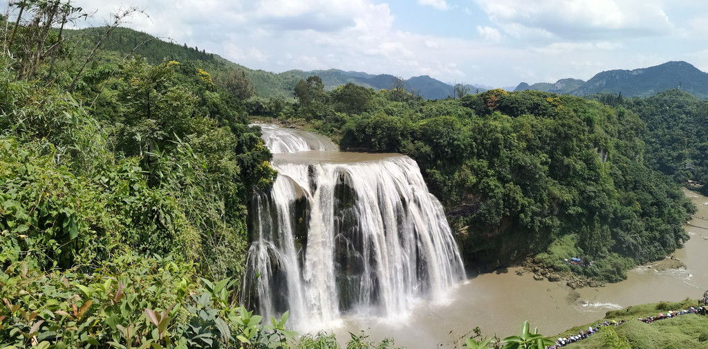 终于可以看到黄果树大瀑布了,远远地看过去,在青翠的山体间,一个巨大的瀑布悬挂而下。