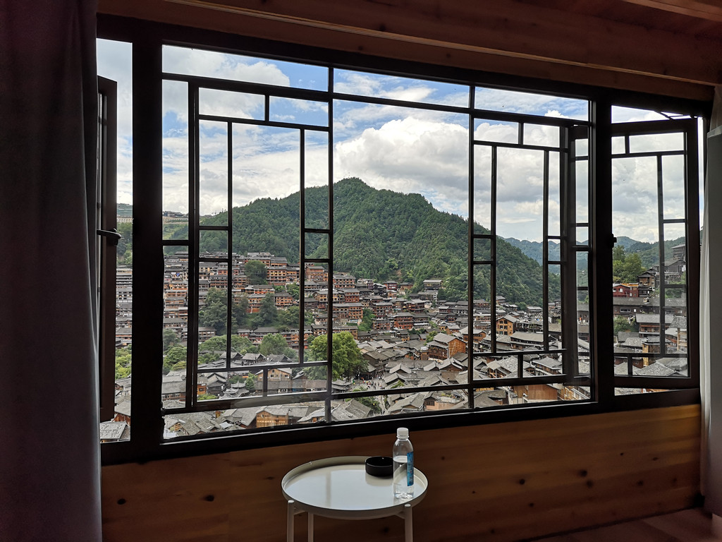 整幢楼都是木质的,所以走在楼梯和地板上,到处都是嗵嗵响。走进最顶头的一间房,面积大约是一般酒店的标间大小,进门左侧是卫生间和淋浴间和一个敞开式浴缸,再往里是一张大床,往前看过去,一整排的木格窗,将外面的景致尽收眼底。坐在窗前的沙发里,整个山坳挤满了密密层层的棕色木楼和青瓦屋顶,吊脚楼一层一层一直蔓延到两侧青山的半山腰,在蓝天白云的映衬下,特别有层次感、古朴感,尤其身处半山腰的客栈房间里,避开了古街上的喧嚣,闻着木楼的木香,悠闲地看着景、品着茶,犹如置身世外桃源。
