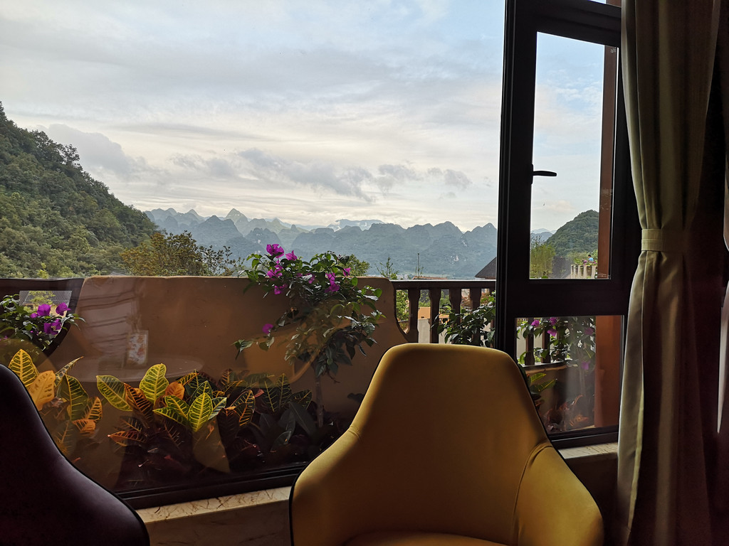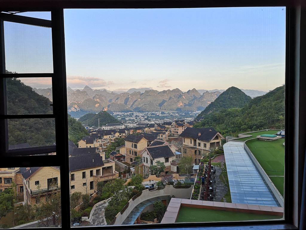 早晨醒来,打开自动窗帘,又一个个惊喜出现在眼前:晨光下的万峰林就在落地窗外,景观绝佳。酒店本身就在半山腰,我们又住在主楼的最高一层,景观非常正,没有建筑的遮挡,所以视觉效果非常好。