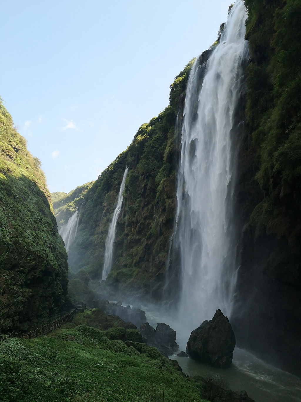 十点钟走进黄果树瀑布景区,乘扶手电梯下到谷底,沿着河边往前走,远远地就可以听到轰鸣声。