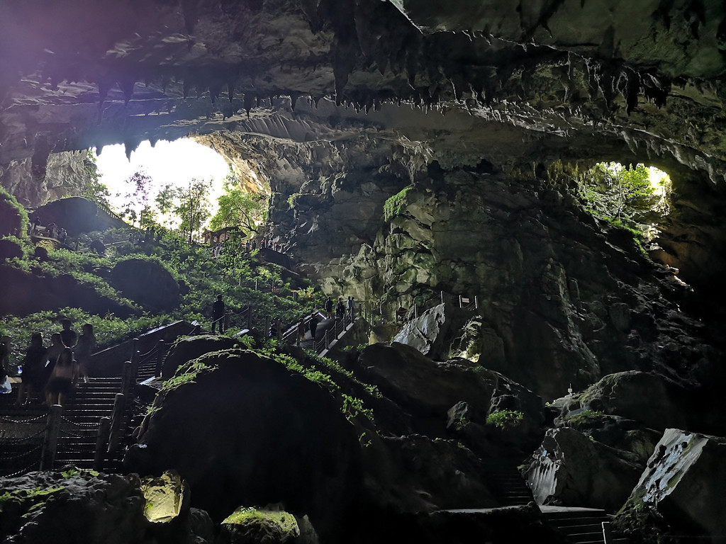 织金洞洞口很大,有台阶斜斜地延伸向地下,仅仅是站在洞口,已经能够感觉到明显的凉意,据标示,洞中只有14度,正常应该穿长衣长裤,像我们短衣短裤,感觉有点冷。回望洞口,正好一大一小两个口:“日月同辉”。