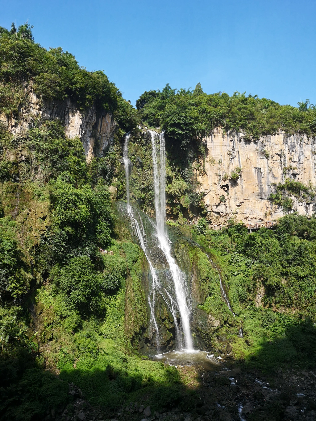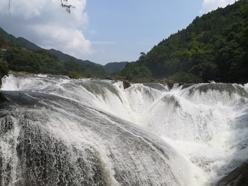 从吊桥横跨马岭河来到西岸,继续往前,很快就到达了珍珠瀑布和最壮美的万马奔腾瀑布,瀑布就在对岸,从高高的崖顶跌落下来。。