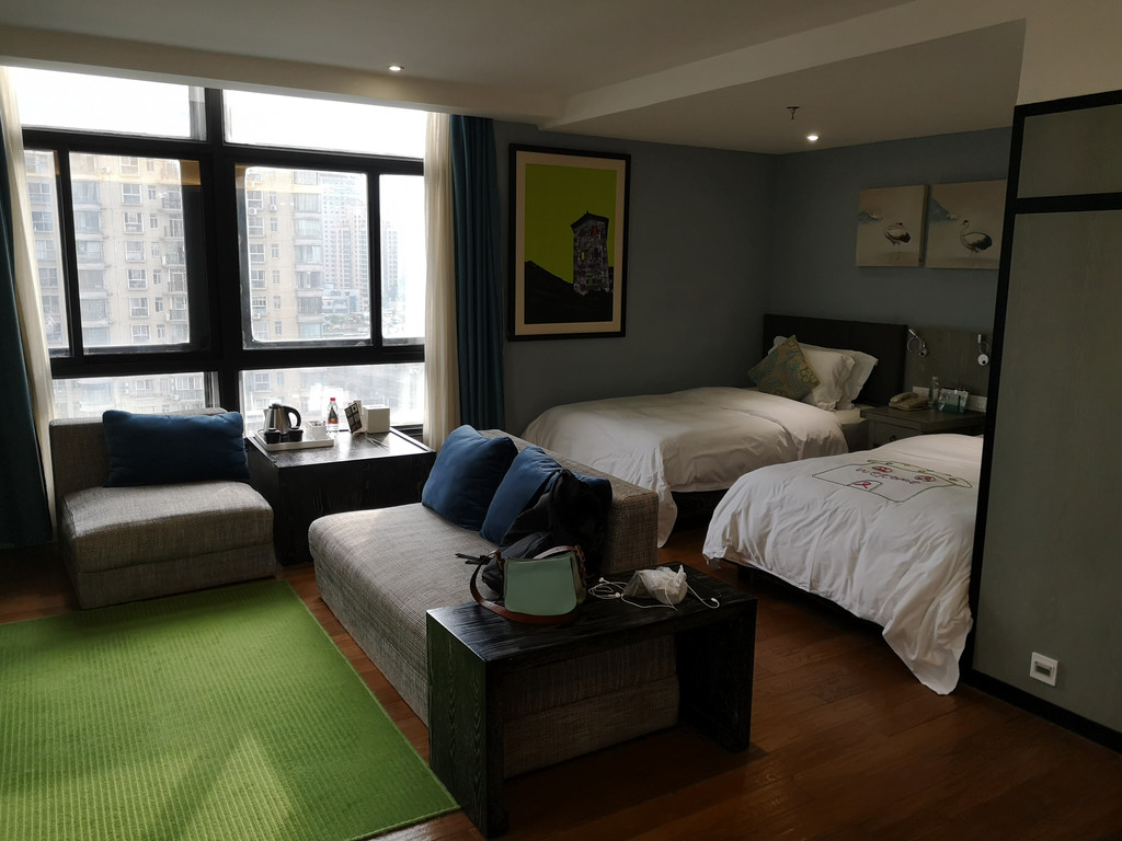 办理入住的大堂在顶楼,办好手续,进入房间,面积很大,装修很有艺术氛围,总体是绿色调。进门左侧是卫生间和盥洗室,再往前的左侧是一个相对独立的书桌空间;进门右侧是一排固定的橱柜,绕过衣柜,背后是两张床,处在一个独立和半封闭的空间中,睡在床上会很有安全感,床头和侧面都靠着墙;床尾处,是一组沙发,对着一台大电视,可以坐在沙发上看电视,也可以躺在床上看;迎着门的一面墙都是窗户,会客区的侧面也是一大扇窗户,整个房间非常方正、敞亮、透气,各个功能区又相对独立、互不干扰。这个酒店不新,但好处是房间里完全没有什么异味,置身其间,很舒服的感觉。