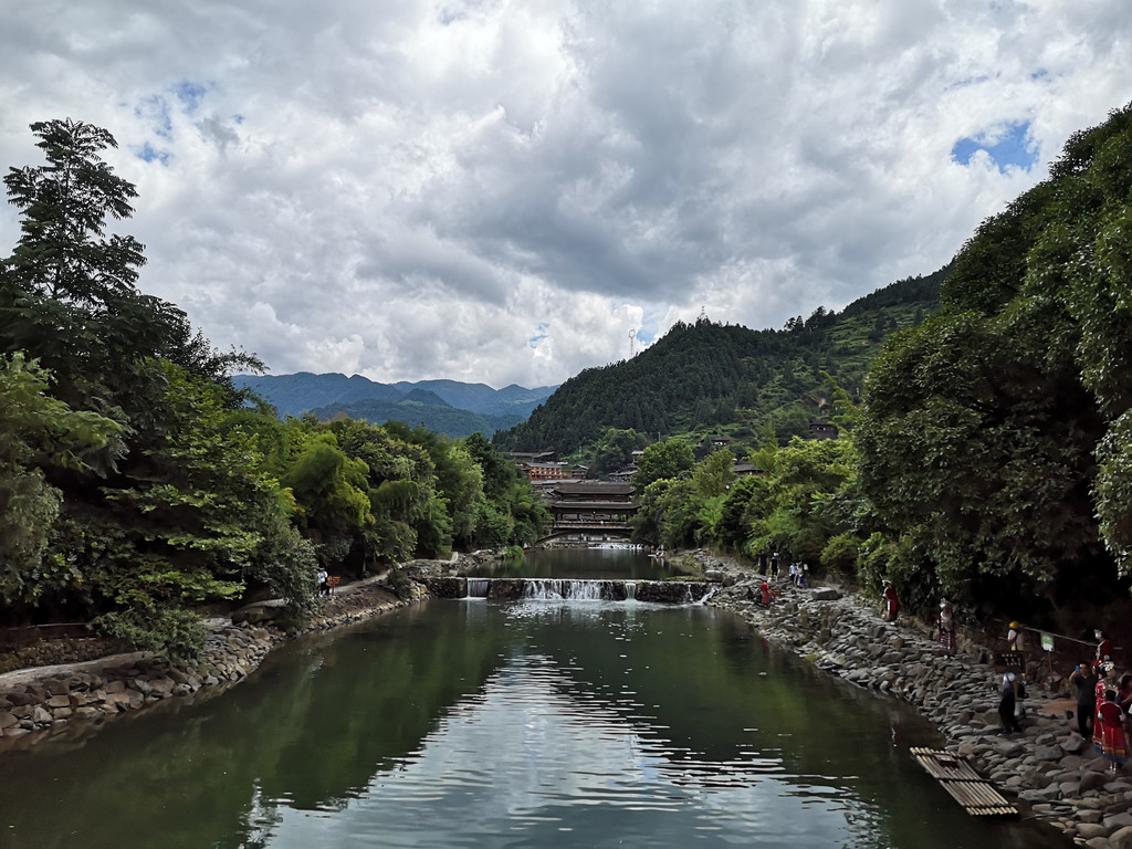 早晨七点,太阳从我们背后升起,照在对面山坡上,暖暖的,整个山谷、整个村寨都苏醒了。时间还早,我们下山逛逛,古街上游人很少,显得很安静。我们钻进嘎歌古巷,顺山势而下,在小巷中穿行,很快就来到了穿村而过,整个苗寨地势最低的小河旁。河水潺潺流过,清澈见底,绿水倒映着青山,河中的石坝,将小河分成了一层一层,逐级而下。河岸边、石坝上,偶有早起的游人在拍照留影。