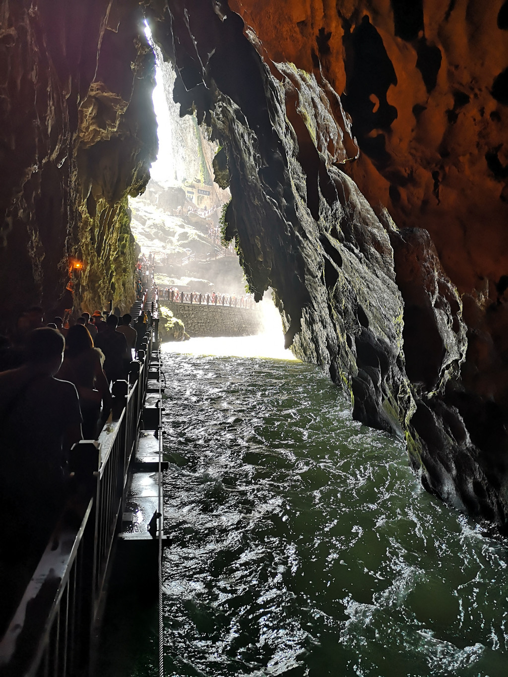 拐一个弯,河流进入了又一个更加幽深的洞口,里面可能还有更刺激的地下洞穴和地下暗河,但旁边山崖上贴着告示,由于雨季水大,里面的景点暂时关闭,不开放。