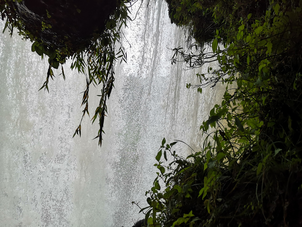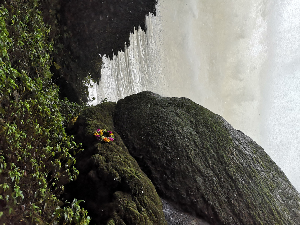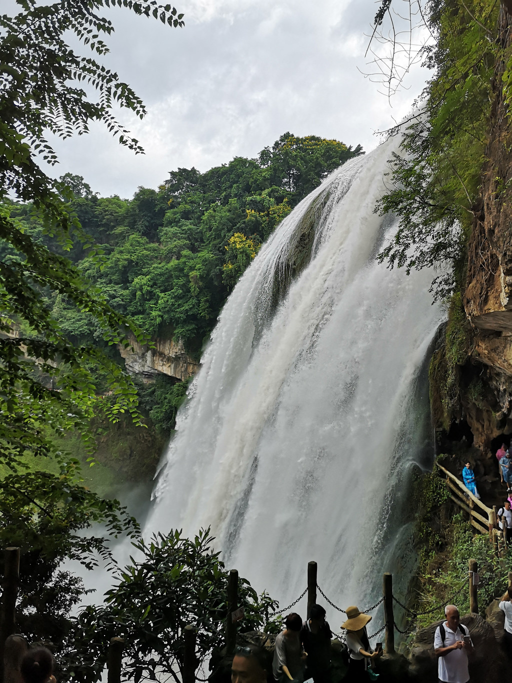 我们穿上一次性雨衣,十点半开始排队去大瀑布后面的水帘洞。今天人挺多,随着队伍慢慢地往前、往山上挪动,不知不觉来到了大瀑布的正对面,此时,水流跌落深潭的轰鸣声,几乎掩盖了周围的其它噪音;跌落潭底的水又激起无数的水雾,向我们站的这个山坡岸边扑来,满脸、满眼镜、满雨衣都是水,雨衣中的身体,此时也是湿漉漉,应该是雨衣捂出来的汗水,所以此时,也不知哪些是汗水,哪些是瀑布水了。