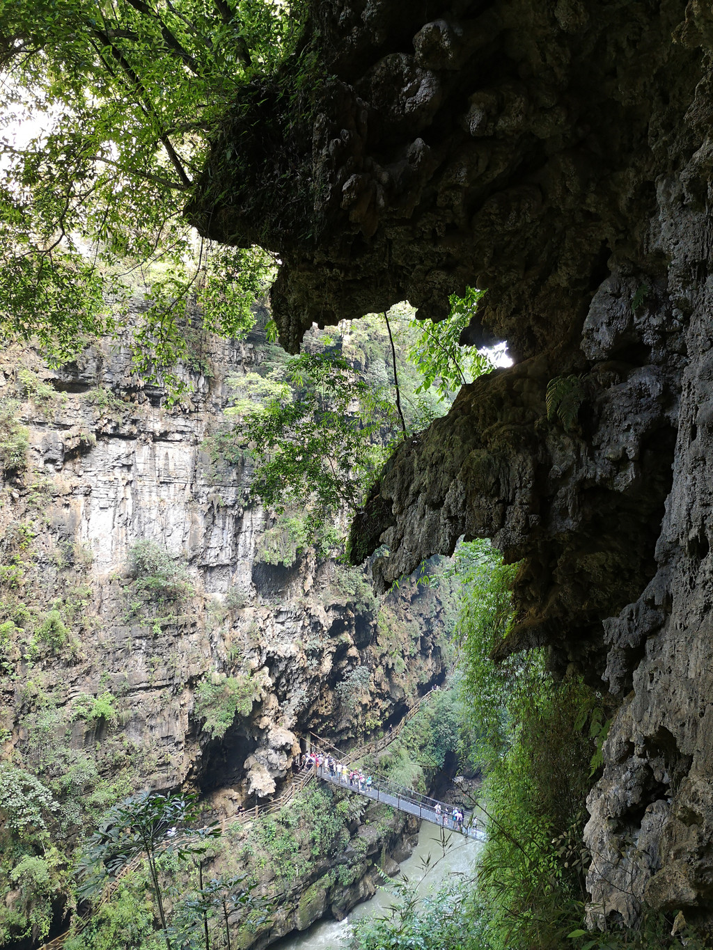 乘电梯下到谷底,我们跨过双虹桥,经过江心遗迹,来到东岸,沿着东侧石壁上的路上行,在深深的谷底,举头仰望,是大地裂开的一道裂缝,据说这里是地球上最美的伤口。