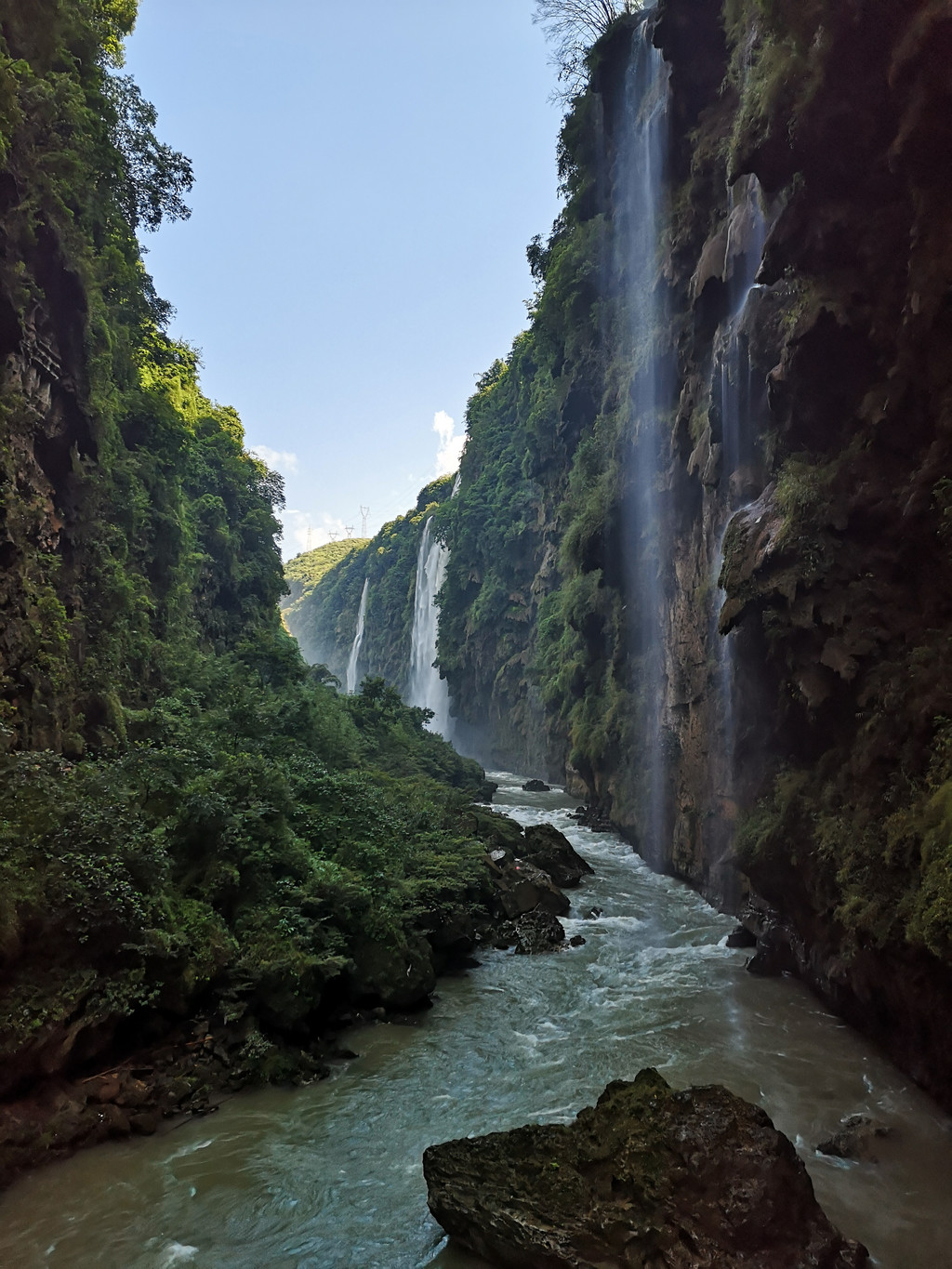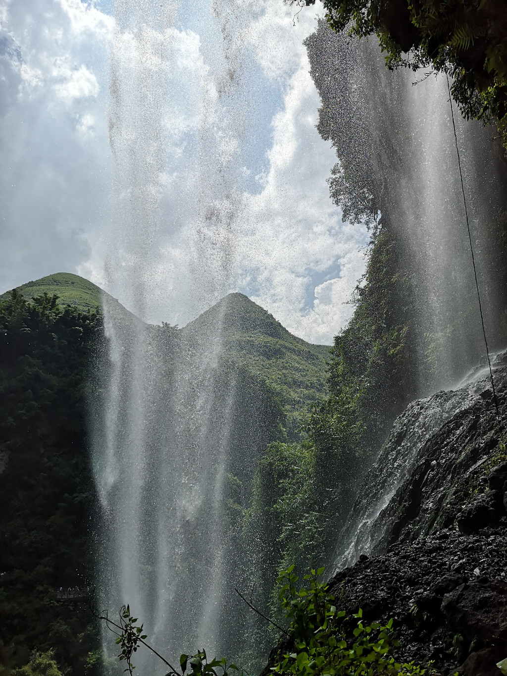 十一点三刻,排了一个多小时的队,我们终于走进了水帘洞。这是在大瀑布背后的山体中自然形成的一个洞穴,正好横穿整个大瀑布,从这端进去,从另一端出来。横穿洞穴时,不时有面向瀑布敞开的洞口,巨大的水流从头顶倾泻而下,在近在咫尺的眼前形成一道水帘,再落向下方不可见的深处。水帘洞本身并没有太出奇之处,但身在大瀑布之后,这就不能不感叹大自然的鬼斧神工了!