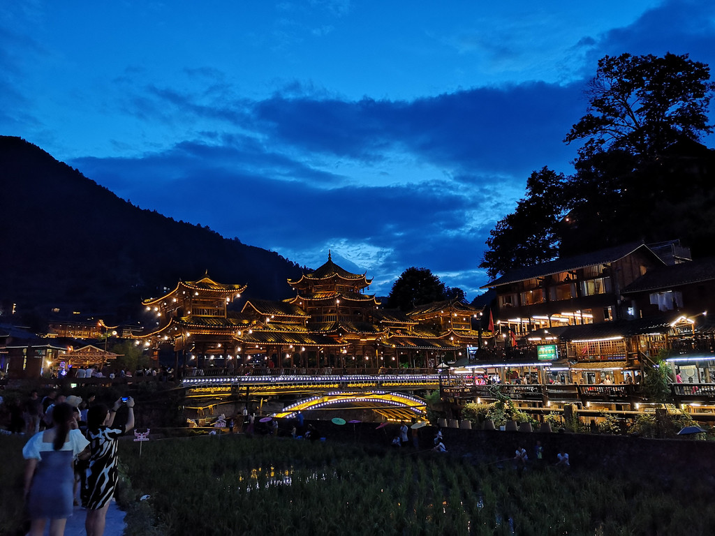 天色渐渐暗了下来,黛青色的天,墨色剪影的山,华灯初放的风雨桥,组成一幅美丽的图画。