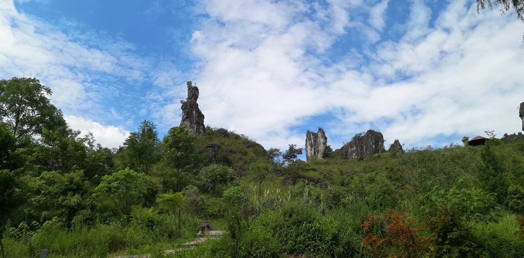 第一站前往竹林堡石林,走进石林,一座座奇形怪状的石柱在蓝天白云背景下的山谷间,显得特别的挺拔,有的像高冠博带的古人,有的像一柱擎天,有的像仙人弈棋,有的像高僧坐禅入定,……。云南昆明的石林与这里的风格完全不一样,走进云南石林就像进入了森林迷宫,更多感觉到奇,这里除了奇,还有壮阔的感觉。