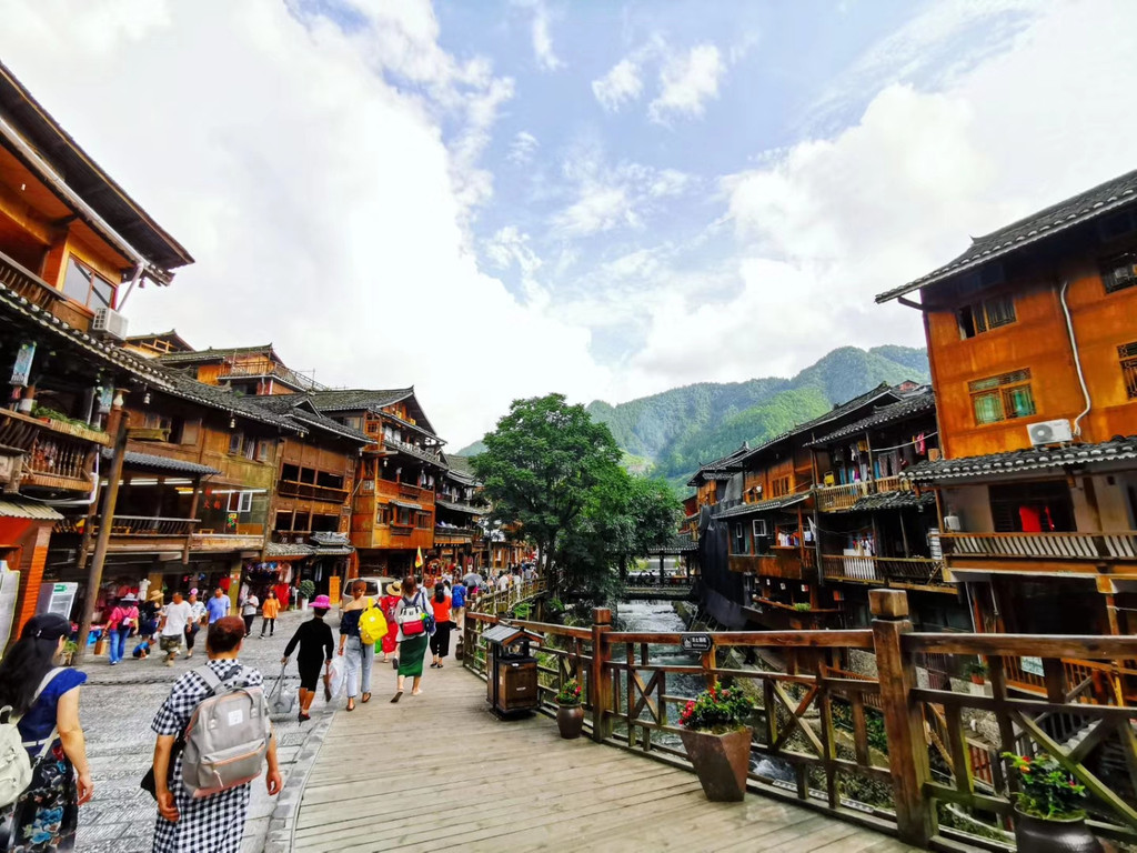 逛完大七孔小七孔,下午长途跋涉到达西江苗寨,坐车为什么需要安全带和扶手呢?因为怕我们睡着的时候摔倒,我睡到整个人歪出过道去了,真的开了好久,困到我劈叉。到达苗寨我们住第一号风雨桥,等于穿越了整个寨子才到我们那。放好行李去进行打糍粑活动,新鲜热乎很好吃,小朋友都是去摆拍的,因为他们根本连锤子都抬不动,哈哈。然后苗服体验,完了再去长桌宴晚饭,饭后坐电瓶车去观景台看千户苗寨夜景,嗯……我觉得白天比较好看。