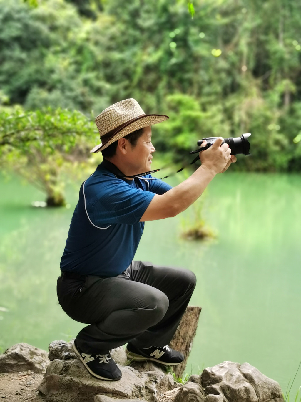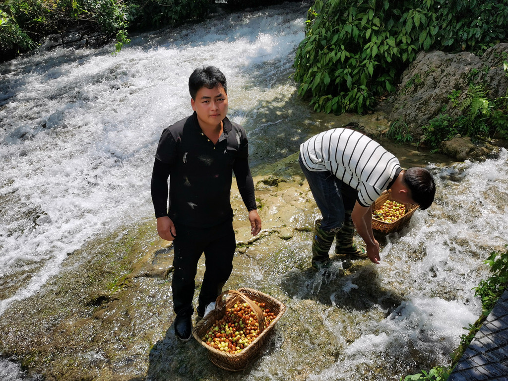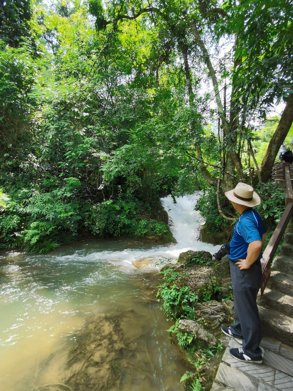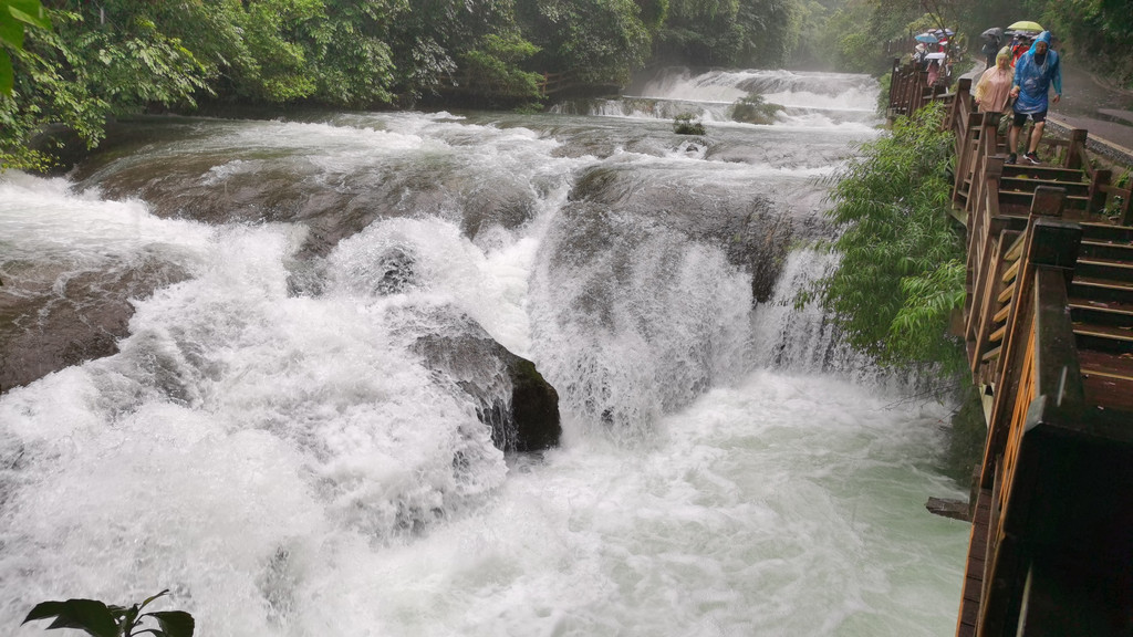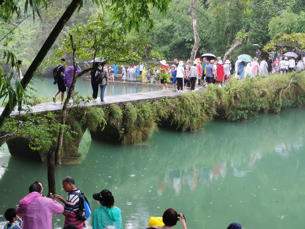 石上森林就是沿着响水河顺流而下。此时水面宽阔、气势壮观。伴着两侧的山峰或瀑或泄总有风景。河水翻滚而下,颇有气势。一层一瀑形成了风光有异的一共68级下跌瀑流。浩浩荡荡太吸引人了。可惜突然一声惊雷,风云突变,头上的阳光,变成了滚滚乌云。骤雨纷纷无处可躲,人就变了狼狈的落汤鸡。但是也有勇敢的年轻人,敢于冒雨走向奔腾的河中留影,我为他们的洒脱点赞!一路顺跌瀑而行,眼球总被那飞泻的响水河所吸引。这一路可是无限的水上风光。以致纵然洒雨一身也无怨无悔。看到那大名鼎鼎的小七孔桥,反而觉得没有那层层跌瀑的气势和风光。