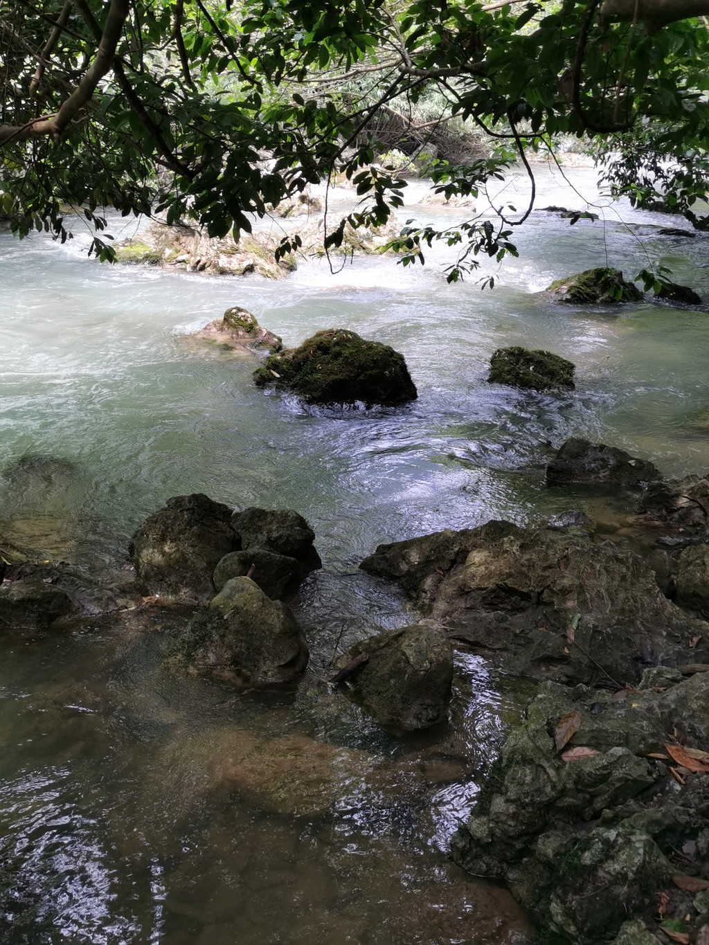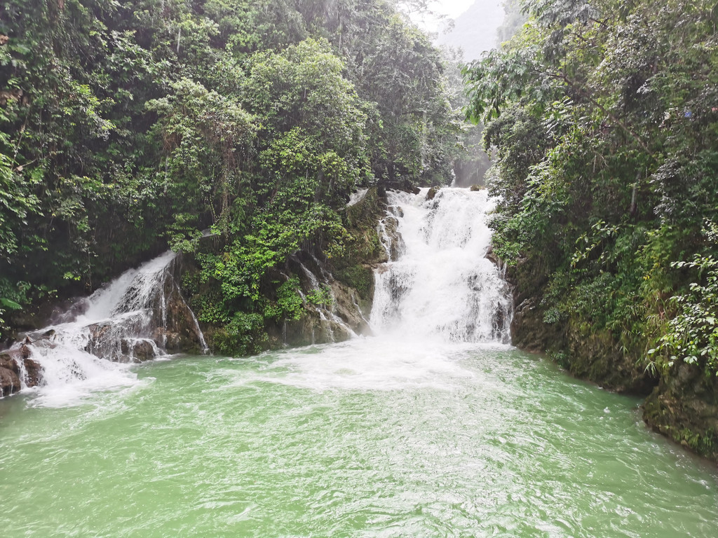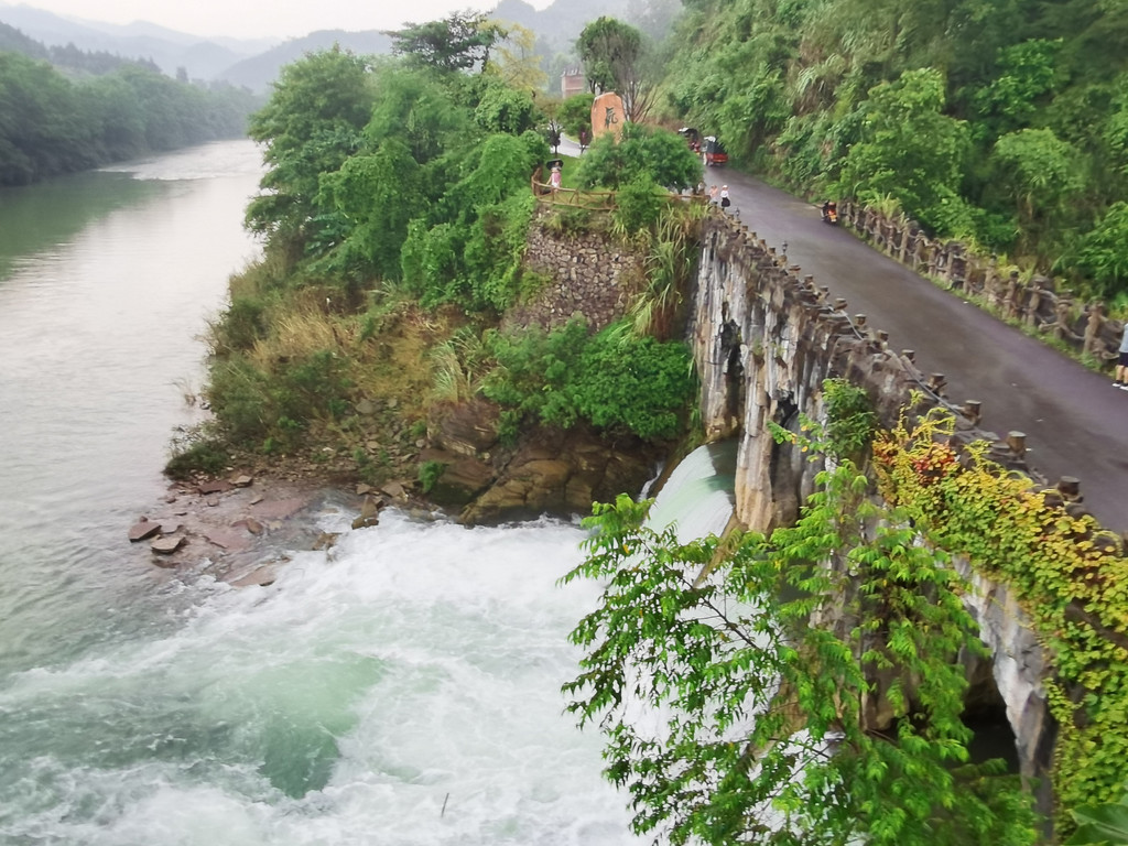 沿着水流向翠谷瀑布而去。一路流水潺潺,开阔处山映水平,犹如一幅桂林山水图。翠谷瀑布出自高山之间,喷涌而出,仿佛自天而降的天河。引多少人驻足欣赏、多少家入水嬉戏?我们走入了水上森林。钻入林间耳边都是爽爽的流水声。弯弯曲曲,穿树林、绕岩石,或飞瀑条条,或怒波翻滚。乃流动的音符。斑驳的光影,清新的气息。一步一景,充满着清幽,弥漫着诗意。无论在水边轻语呢喃,或者泉旁持觞吟诵,都是令人心醉。