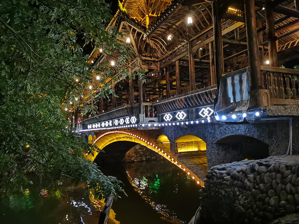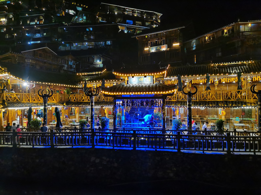 千户苗寨有规模,有特色。白天晚上都有别样的风景。主要的美景沿着一条穿寨而过的河流之边,一共有七座各具特色的桥。苗寨相接,檐突角飞。排排的吊脚楼等建筑有特色也讲究。晚上华灯四起、流光溢彩,建筑、桥型、流水等光影很美,也很有别样的风情。乘沐清风可以街上闲逛也可以河边絮语。由于在此都是依山而建,都是层层叠叠,在夜色灯光里仿佛是满天繁星。白天仰视就是空中之城。