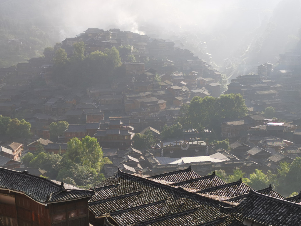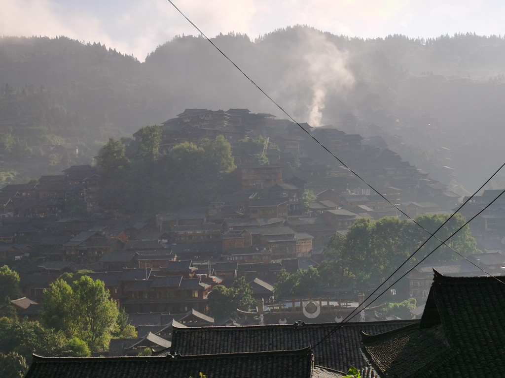 最美的风景在清晨。早餐时有团友说上山顶观景台晨曦很美。因为我们住在山上,上山顶观景台并不遥远,连忙登山而行。登上观景台,果然惊艳。众山层层、炊烟轻袅、云霞迷离。俯瞰层层的苗寨在云烟中、在树丛旁,飞檐斗角变化万千。山在飘渺处,寨在云霞里。仙气荡漾,怎一个美字了得!