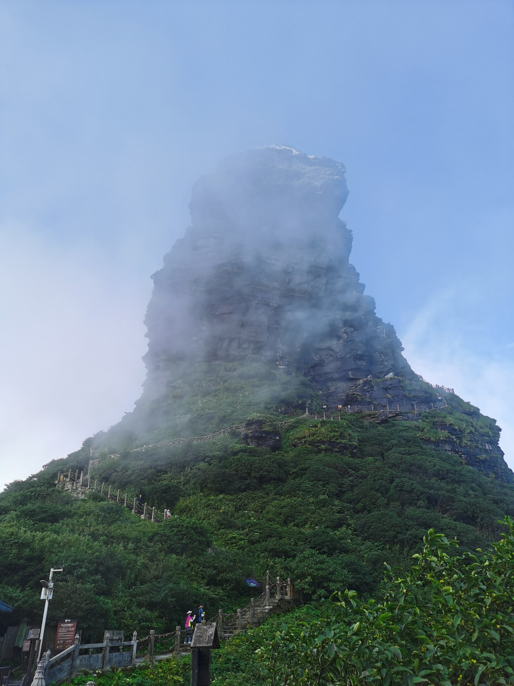 哇!正是阳光普照,蓝天朗日。这边是白云奔腾,那方是群山起舞,两边的金顶是黑岩嶙峋、拔地指天,顶上是隐隐的庙宇。云飘处欲隐欲现。尽显了灵气和仙气。观景台也是一处高地,几柱蘑菇石,形奇神美。风光万千可以一望万里。梵净山梵天净地,举目皆景,名不虚传。拜佛朝圣要心诚志坚。敢不敢上金顶也是一种考验。我们走向了红云金顶。金顶拔地擎天,100多米高度,四周皆绝壁。上顶需要手脚并用、扶索而登。石阶又陡又窄,仅容一人而过。先垂直攀爬,再走过一道绝壁天缝,顶上有座天桥。登上金顶,气闲神定,倚石望天,凭栏远眺,凝心禅思。参悟了人生,放空了自己。欣赏了美景,洗涤了心灵。收获满满,感谢我佛!