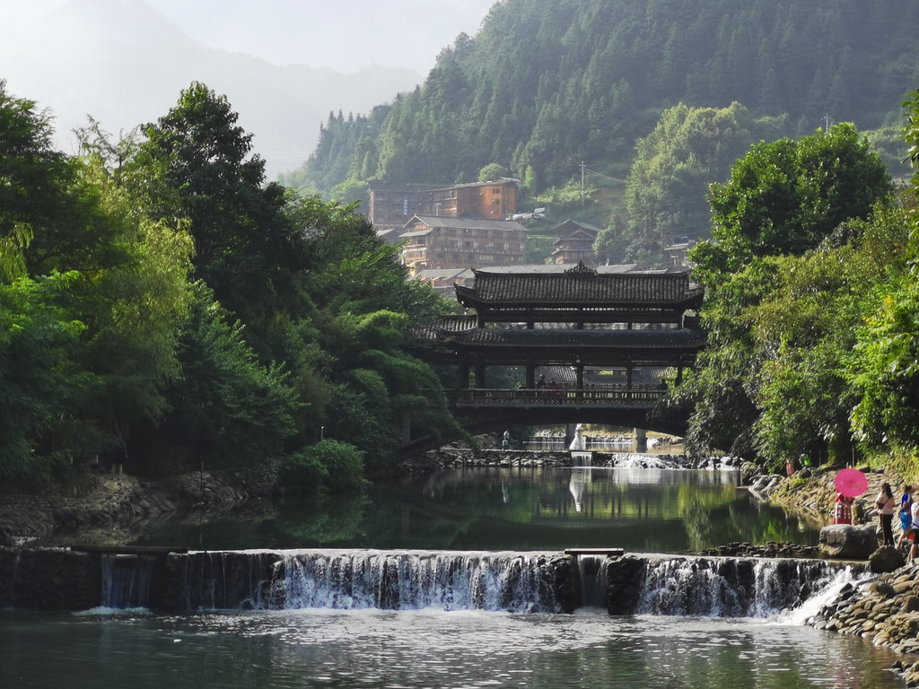 贵州多村寨。正因为交通不便和闭塞,反而使许多古镇、小村和许多有特色的少数民族寨子得以保存,而成为特色。我们走的是经典景点,至多是蜻蜓点水。这次的游览,参观了镇远古镇、青岩古镇和千户苗寨。落于黔东南地区的镇远古镇是有悠久历史的地方。但是我们只有两个小时。所以只看风景不揽古情。古镇在群山围抱之中,弯弯的舞阳河蜿穿其间。在河上一座古老的石头多孔古桥上,一座三檐飞角亭子傲人雄立。奇峰河流;民居亭阁;杨柳船舟尽收眼底。都是充满旖旎风光的古韵山水画图。颇有凤凰古城之韵味,当然可能在规模和精致方面,凤凰更胜一筹。