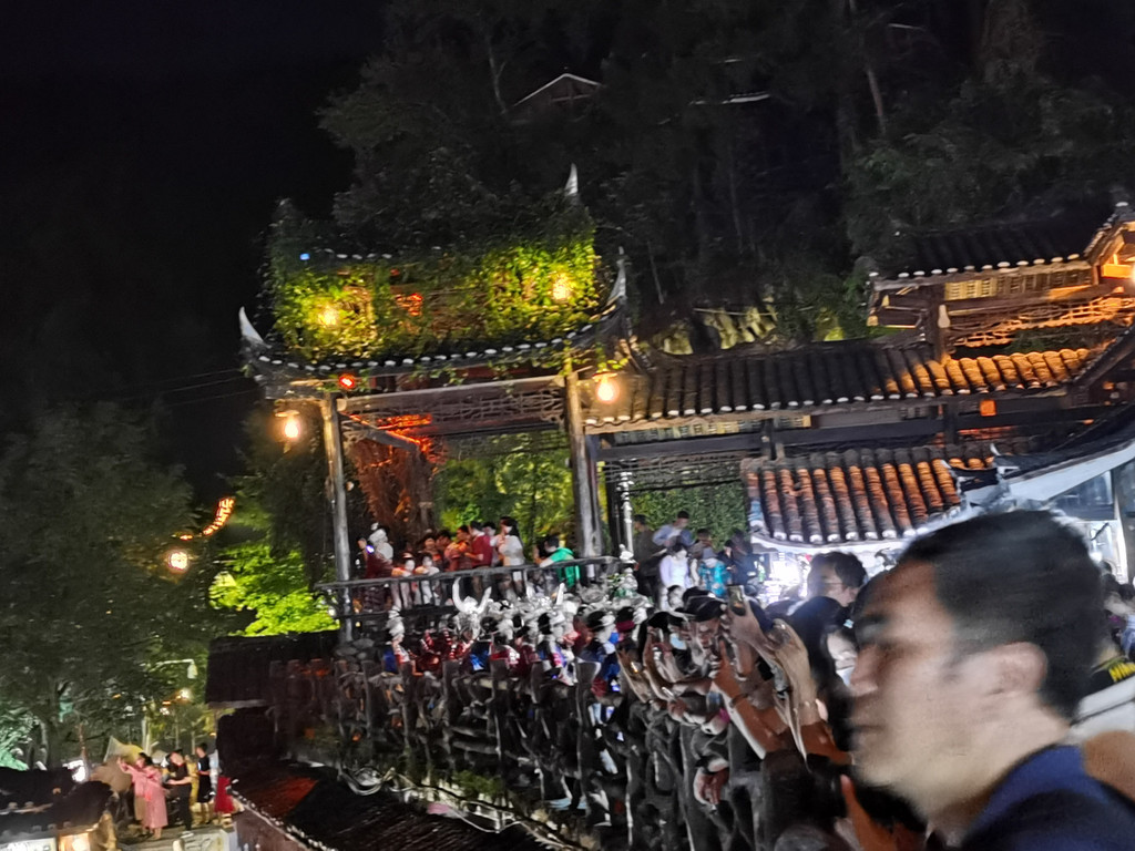 让人留下深刻印象的是千户苗寨。千户苗寨落于黔东南雷山县,有十个依山而建的寨子相连而成,是中国最大的苗族居住村寨。可惜,据说这里现在已不是真正的苗人居住地方了。我傍晚到达千户苗寨,白色重檐的建筑很有特点,在夕阳,霞光的剪影很美。晚餐是尽显苗寨传统风味的长桌火锅。热闹非凡,还有苗族青年吹着芦笙敬酒礼仪。