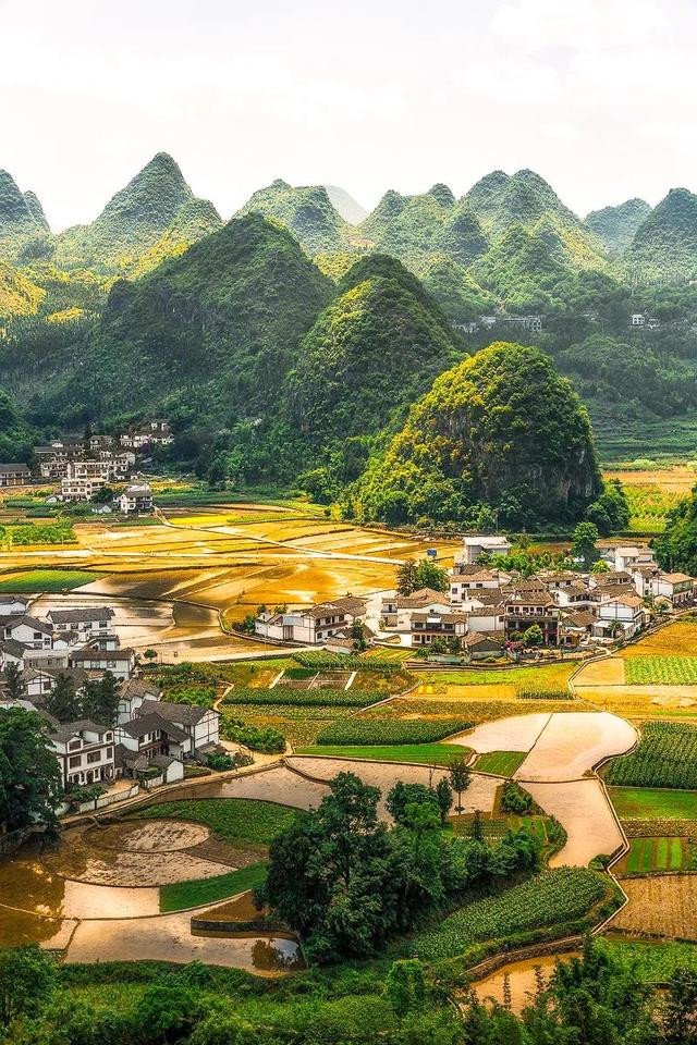 贵州西南的峰林河流、溶洞瀑布、村庄田野